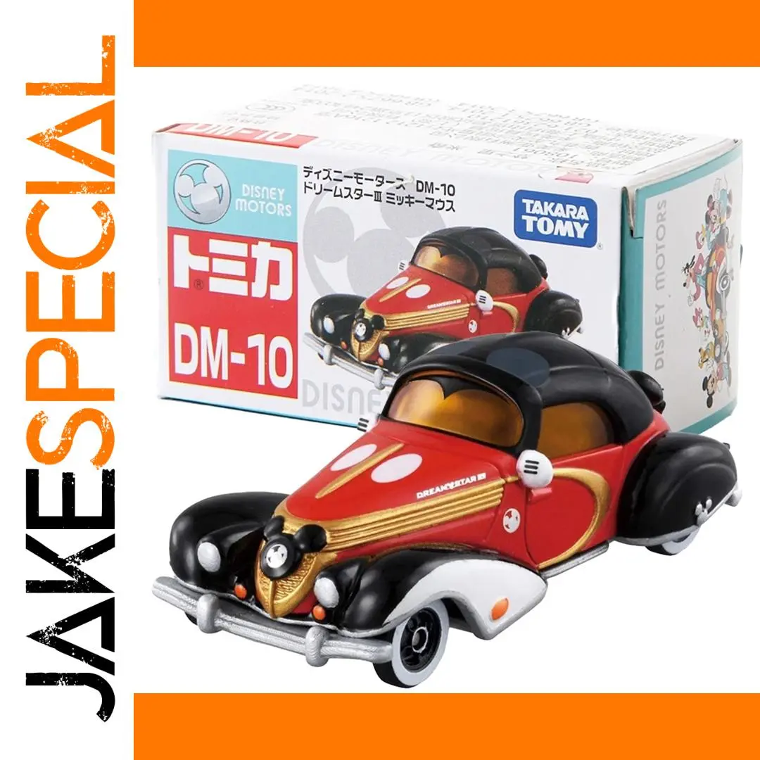 This Takara Tomy 1:64 scale diecast car model, with model number 108061, measures 78mm in width, 39mm in height, and 27mm in depth. Crafted from high-quality metal, it features a realistic, vintage-inspired design with a vibrant red body accented by intricate gold detailing, black fenders, and a sleek black roof. Large white headlights, white sidewall wheels, tinted amber windows, and playful white accents—including a Mouse silhouette logo—bring a whimsical, cartoonish charm. Perfect for collectors aged 14 and above, the mint-condition model offers an exquisite display piece or gift, capturing the nostalgic aesthetic of classic Disney-inspired automobiles.