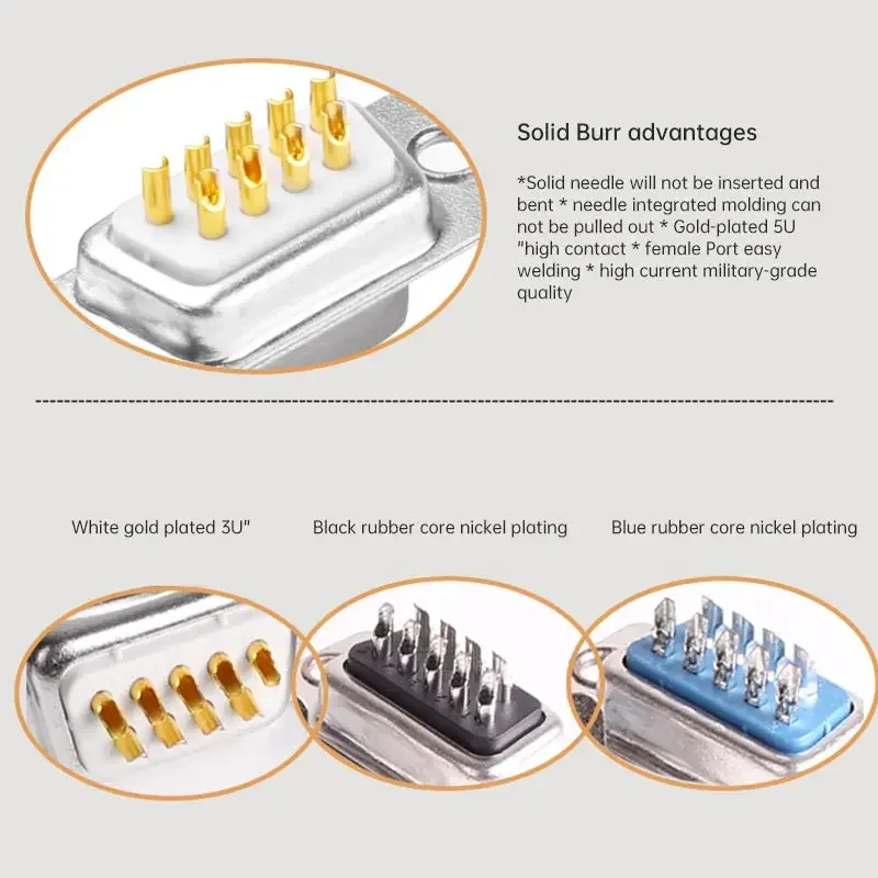 - Available in male or female types, with B, L, S, or W variations for different setups, all featuring a soldering-ready shell with precision gold-plated pins for optimal electrical contact.