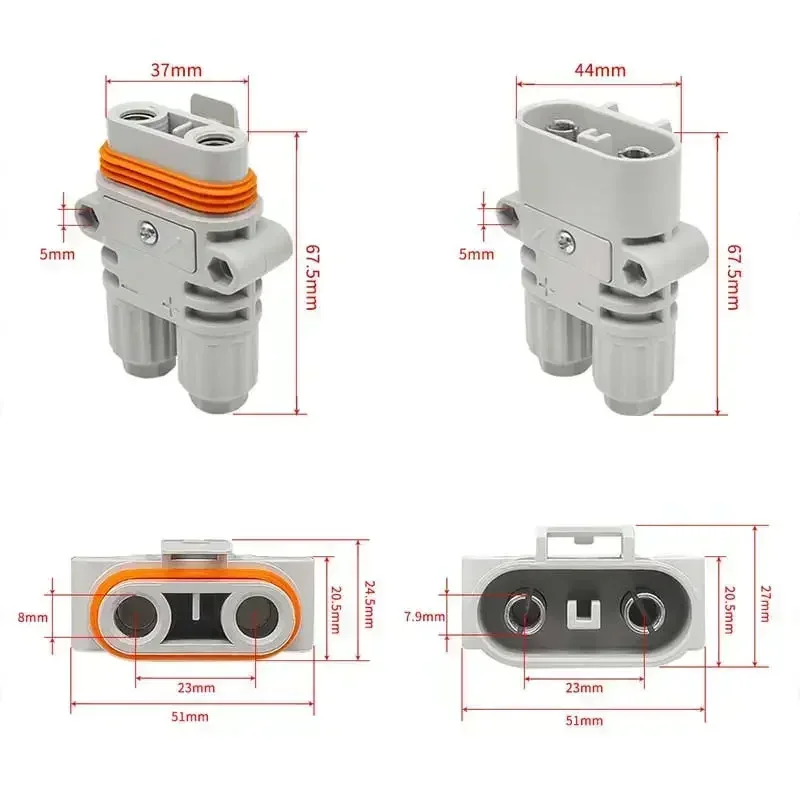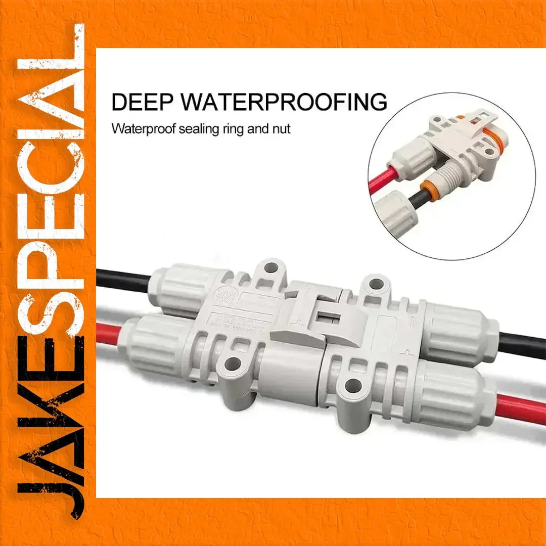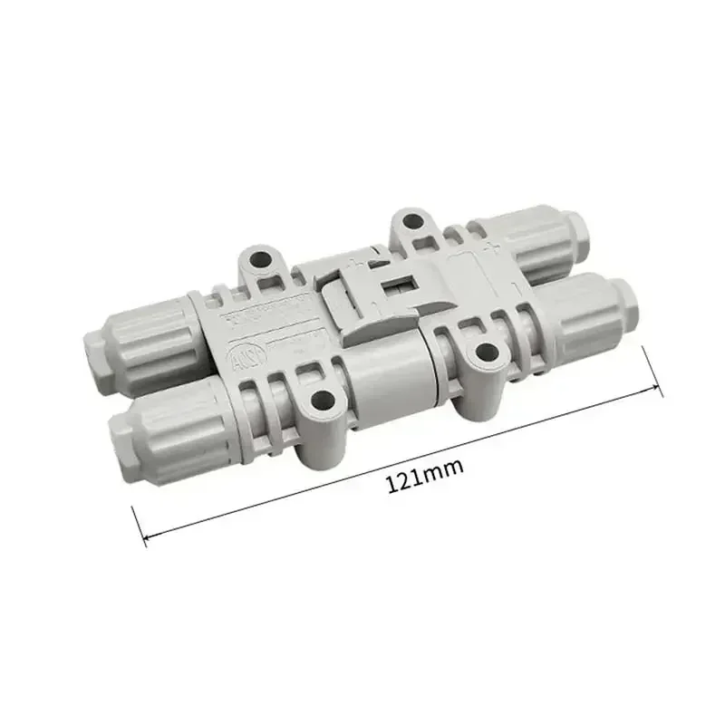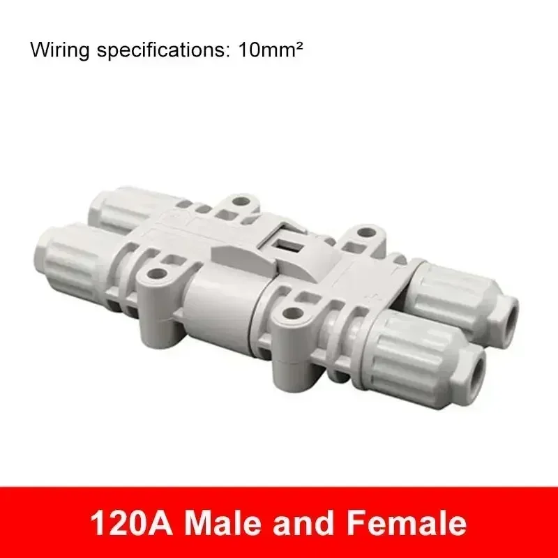 This durable and robust waterproof connector from DIVEDEER is engineered to handle demanding high-current applications with precision. Crafted from a beige or off-white flame-retardant polycarbonate shell, it offers excellent resistance to heat and impact, ensuring safety and longevity. The sleek, rectangular design features smooth surfaces complemented by molded attachment points for secure installation. Large, textured cylindrical cable entry ports with screw-type sealing rings guarantee waterproof sealing, making it ideal for environments exposed to moisture. The connector supports a rated current of 120A and voltage of 1200V, with 10mm² wiring compatibility. It includes a secure locking latch and anti-fall-down buckles, providing stability and easy handling. Copper core contacts ensure reliable electrical conduction, suitable for applications like parking air conditioning, electric vehicles, lithium batteries, and industrial machinery.