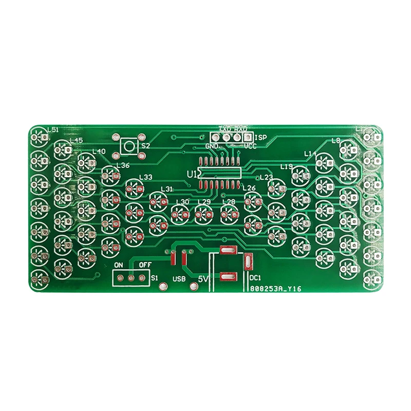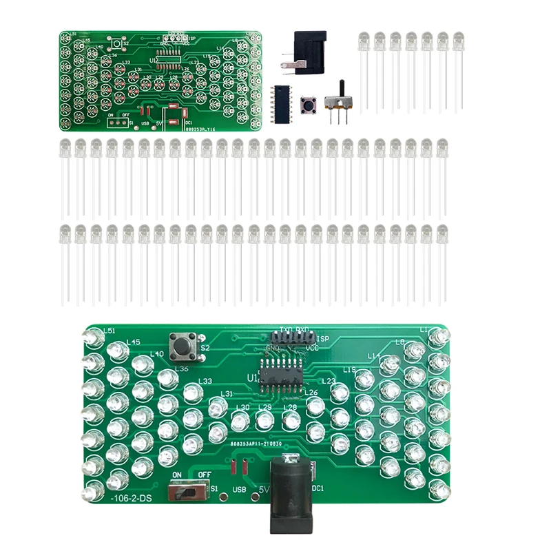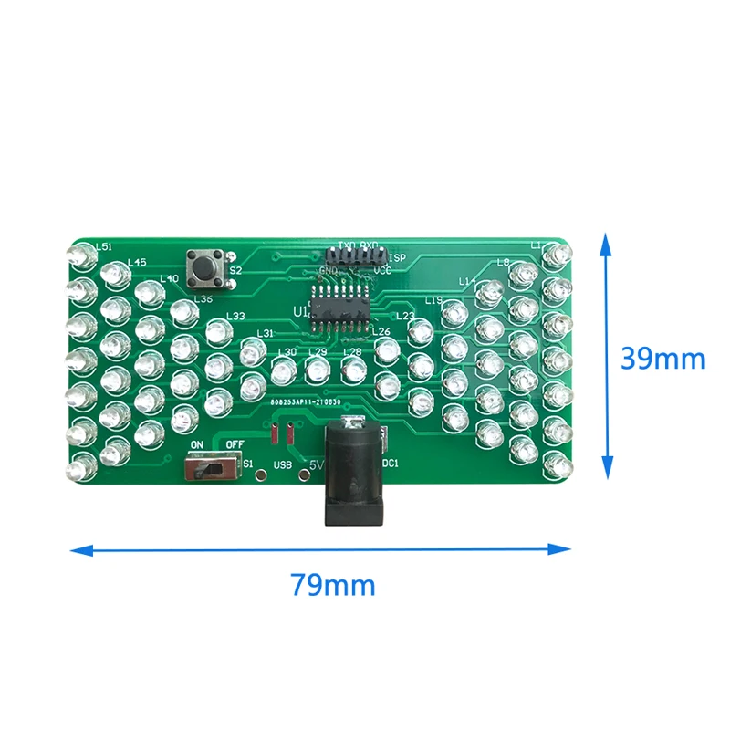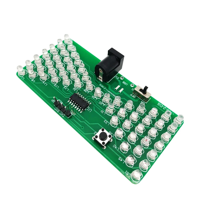Immerse yourself in a captivating DIY experience with this electronic hourglass kit. Crafted on a compact 40x80mm double-sided PCB, it features 57 vibrant blue 3mm LEDs arranged to mimic flowing sand within an hourglass. Controlled by a microcontroller, the kit allows you to customize the sand flow speed via an adjustable micro switch, making each operation unique. Besides the mesmerizing hourglass effect, 28 additional LEDs provide a gentle ambient night light, perfect for relaxing environments. The sleek green solder mask highlights the intricate electrical traces, while the black central chip adds a modern touch. Easy to assemble for enthusiasts, this kit is ideal for both educational purposes and personal enjoyment, offering a hands-on introduction to electronic design and soldering.