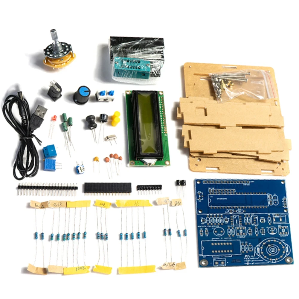 Experience hands-on electronics with this DIY capacitance and inductance tester kit, featuring a clear, compact design housed in a transparent plastic enclosure. It includes a high-visibility yellow-backlit LCD screen displaying real-time frequency measurements, with an internal circuit board in vibrant blue and green shades, neatly arranged with colorful resistors and capacitors. The kit offers a robust black rotary dial with a striking blue and red center for precise adjustments and smaller switches with bold markings for versatile control options. Ideal for educational, hobbyist, and practice projects, this customizable kit encourages soldering skills and technical understanding, providing a reliable tool for accurate capacitance, inductance, and frequency testing.