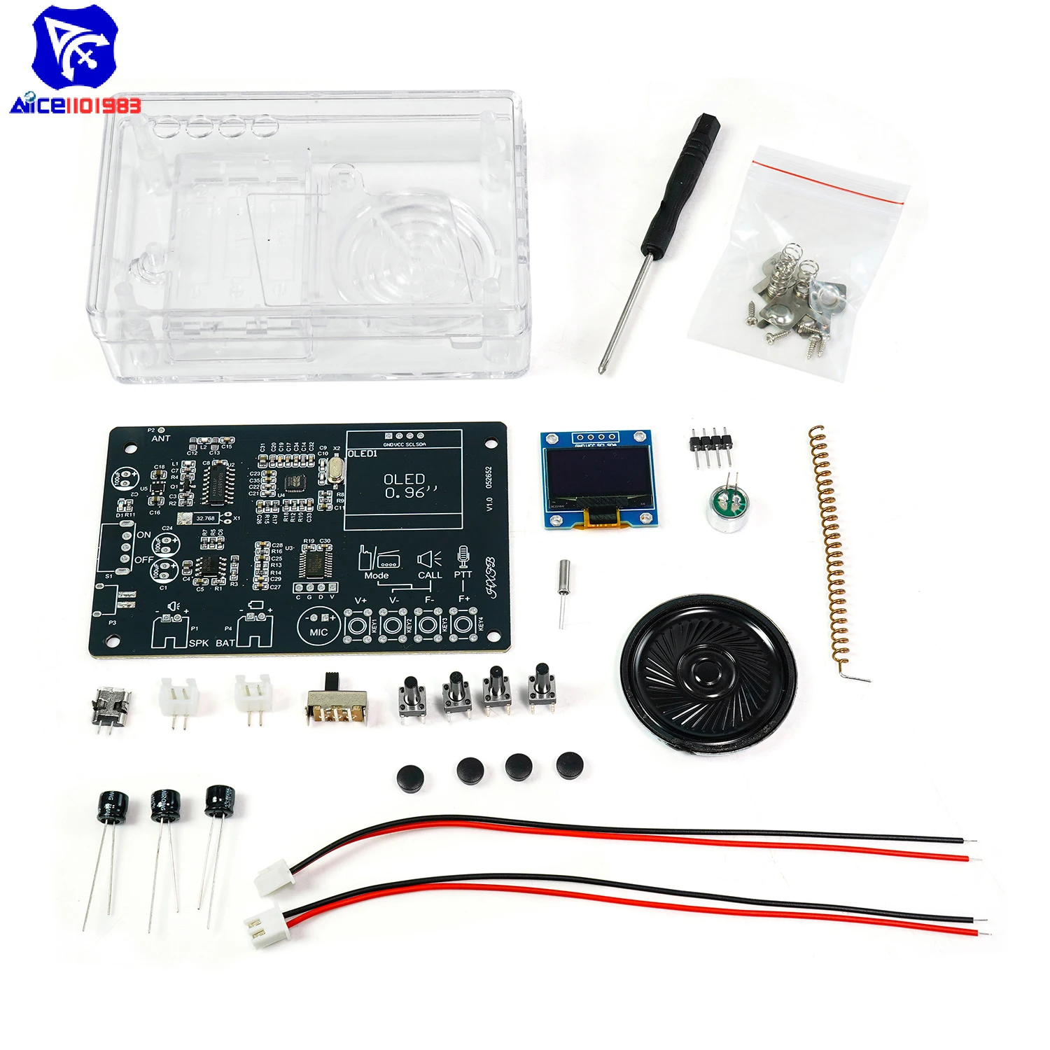 Immerse yourself in the rewarding experience of building your own high-tech communication device with this sleek DIY intercom and radio kit. Encased in a transparent plastic shell, it offers a clear view of the neatly organized internal circuit board featuring black surface-mounted components, colorful resistors, capacitors, and integrated circuits. The intuitive layout includes a vibrant blue OLED display, white connectors, and calibration knobs, all contributing to its ultra-modern aesthetic. Designed for enthusiasts and learners, this kit combines functional durability with aesthetic appeal, encouraging hands-on learning and technical mastery. With its compact size and professional components, it’s perfect for developing practical skills, whether for personal use or educational projects.