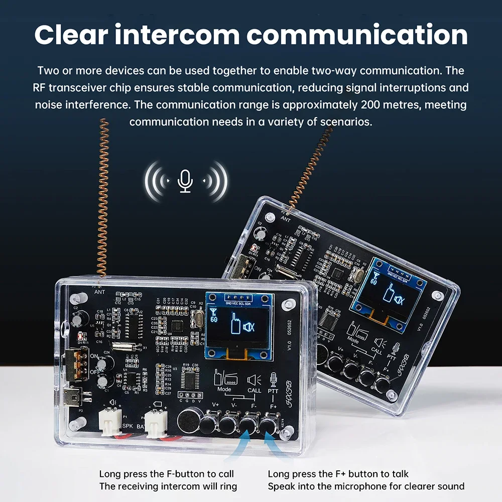 - The kit features integrated intercom and FM radio functions, combining wireless communication with radio listening in one compact device, suitable for DIY electronics enthusiasts.