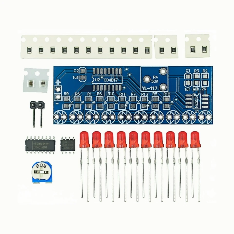 - Includes a series of 10 bright red LEDs and precise surface-mount resistors and capacitors, all clearly labeled and neatly arranged for effortless assembly, fostering a smooth learning curve and DIY experience.