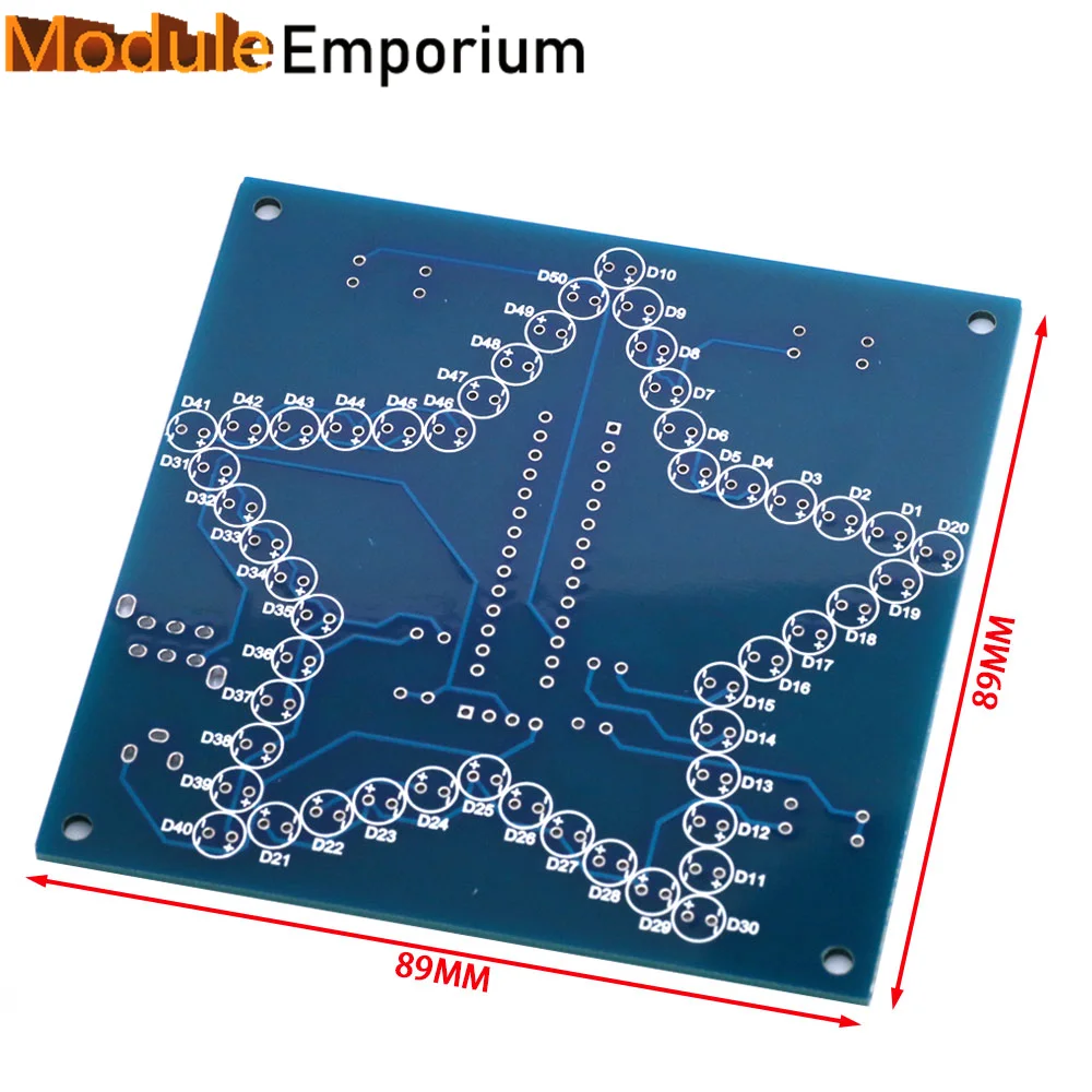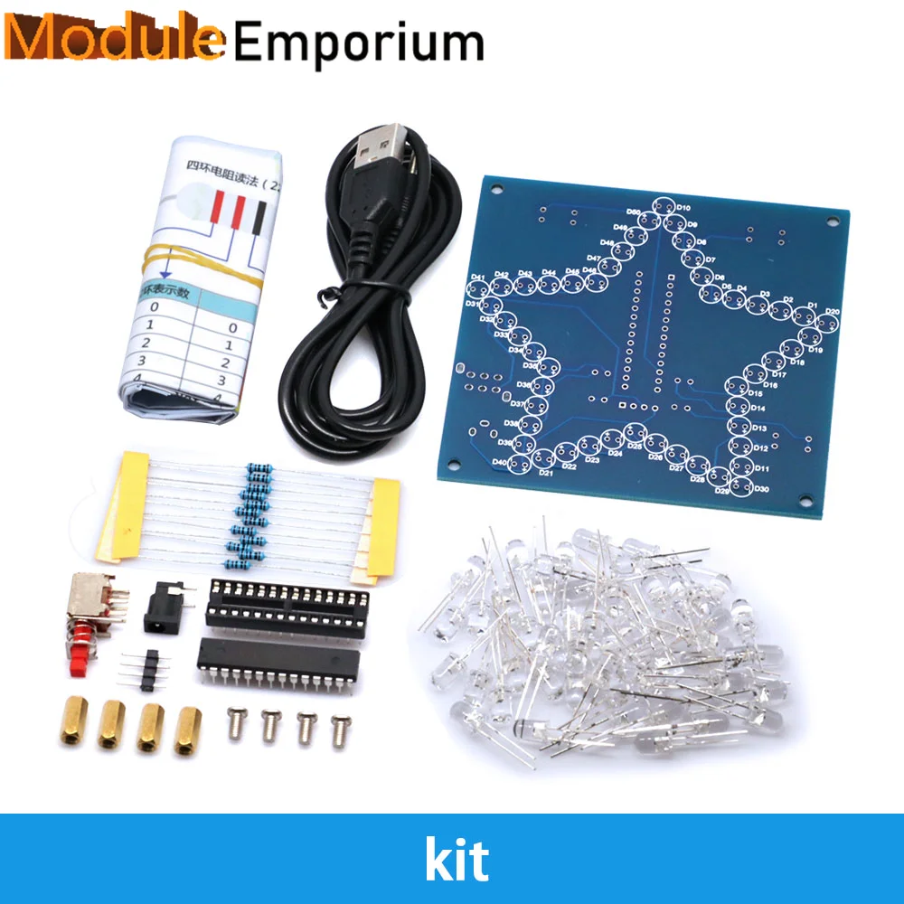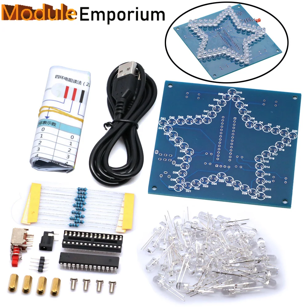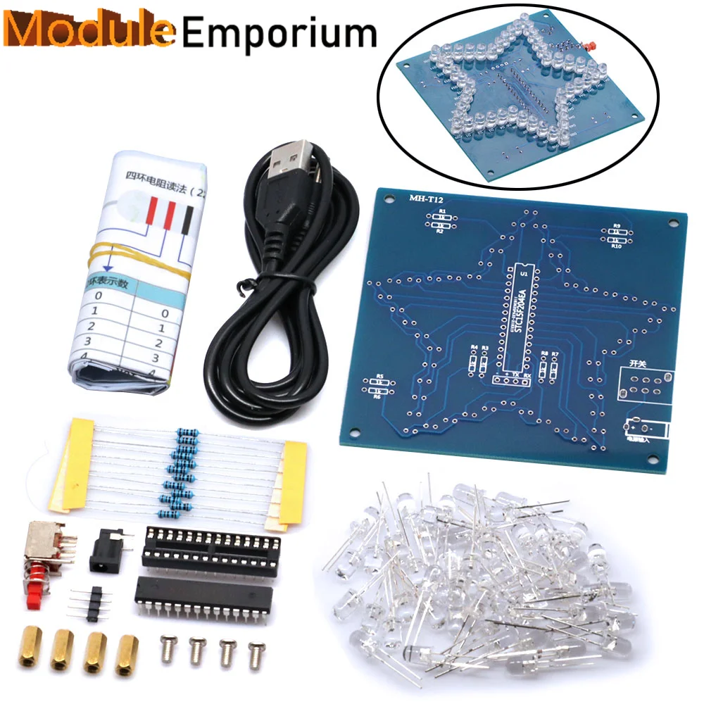 Create a stunning five-pointed star with this DIY electronic kit featuring vibrant RGB LED modules that produce colorful glare effects. It includes a water light display for a mesmerizing visual impact, all controlled via a 51 single-chip microcomputer for easy customization. The kit offers a sleek, transparent star-shaped LED array complemented by a blue perforated circuit board with white printed outlines, gold-colored spacers, and various electronic components like resistors, headers, and a mini switch. Designed for enthusiasts, this high-tech module combines modern aesthetics with functional lighting and water features, perfect for decorative displays or innovative projects.