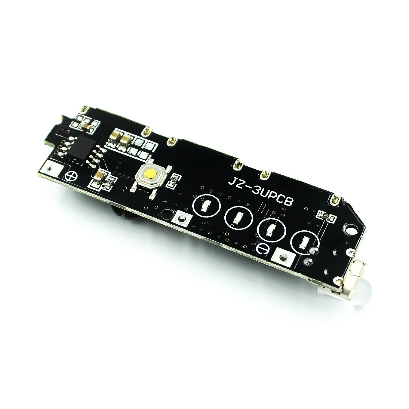 - The board includes a four-level capacity indicator, with a sleek white LED and a white plastic switch, enabling easy monitoring of battery status and effortless power control.