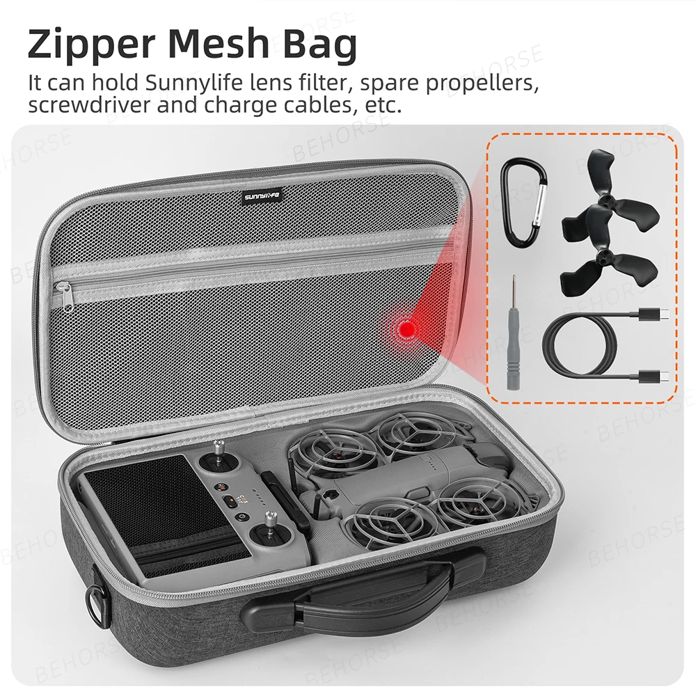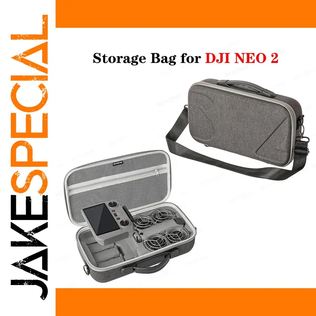 - Designed to store a DJI Neo 2 drone, RC 2 remote control, six batteries (including one in the drone and three in the battery manager), filters, collision bars, propellers, screwdrivers, and charging cables.