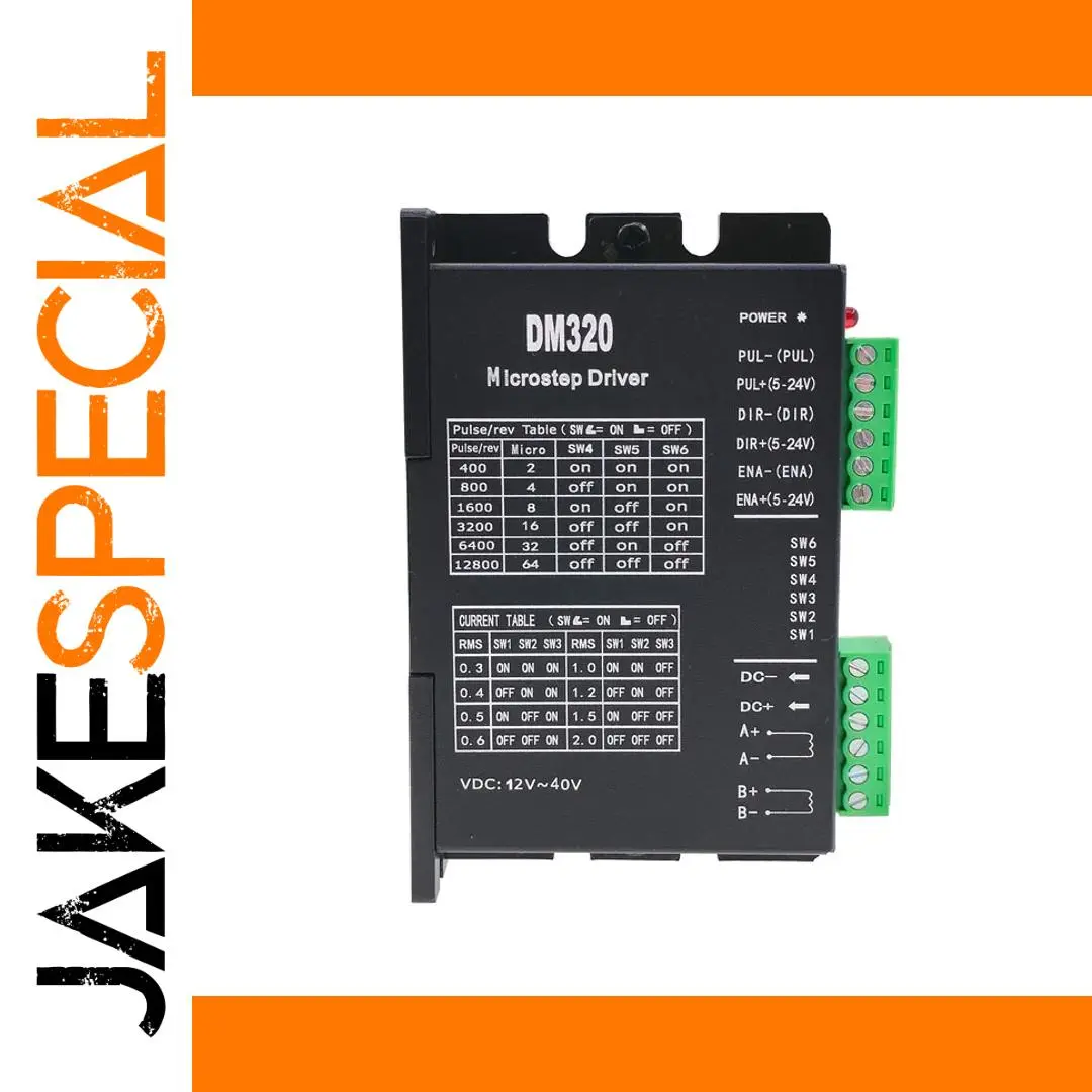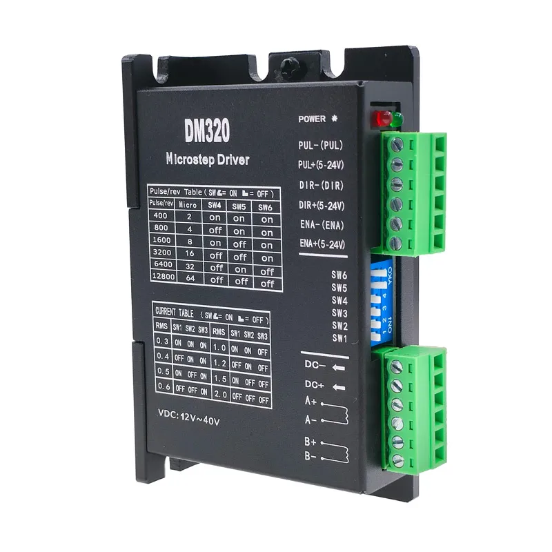 The DM320 2H320 stepper motor driver controller offers precise control with a microstepping resolution of up to 12,800 microsteps per revolution, ideal for brushless DC motors. Designed for compatibility with 28mm, 35mm, and 42mm stepper motors, it features a simple pulse input mode for smooth operation. Operating with a DC power supply, this high-performance controller is perfect for applications requiring high accuracy and reliable motor management in automation, robotics, and CNC systems. Its sleek, industrial design emphasizes functionality and ease of use, making it an essential component for anyone seeking precise, efficient motor control.