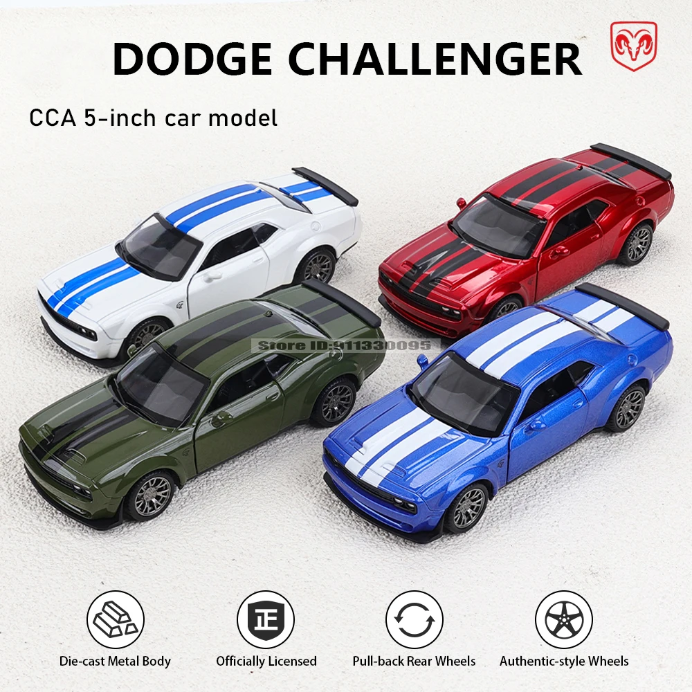 Imagine holding this stunning 5-inch die-cast model of the Dodge Challenger in your hands, feeling the solid construction as you marvel at its rich green color with striking black racing stripes. With intricate detailing, including finely crafted headlights and a stylized grille, it looks just like the real thing. The model's robust zinc alloy body ensures durability, while rubber tires offer smooth movement. Ideal for display or play, it features a pull-back mechanism that propels the car forward, along with opening doors and lights activated by the front wheels. Bring home this attractive piece that perfectly captures the essence of a classic muscle car.