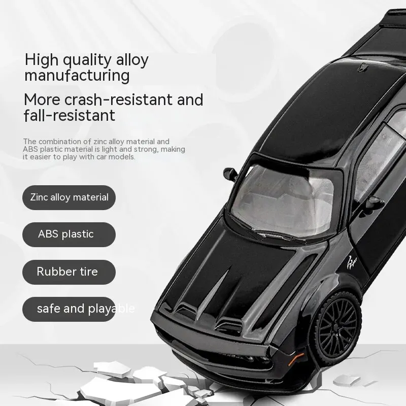 Enhance your collection with this stunning detailed die-cast model of the Dodge Challenger Hellcat. Its realistic design, lighting, and sound features bring an impressive display to any space. Investment in this item allows you to own a piece of automotive excellence—whether for display, admiration, or gifting to fellow enthusiasts. With its premium materials, meticulous craftsmanship, and vibrant color options, this model guarantees durability and aesthetic appeal. Don’t miss out—add this captivating Dodge Challenger Hellcat model to your collection today and enjoy showcasing a true symbol of performance and style!
