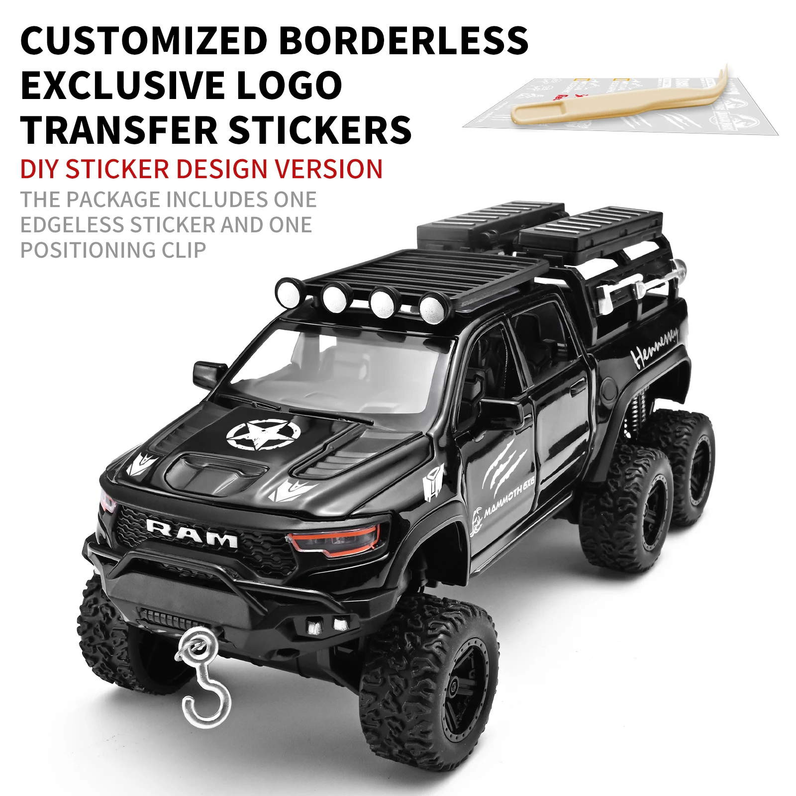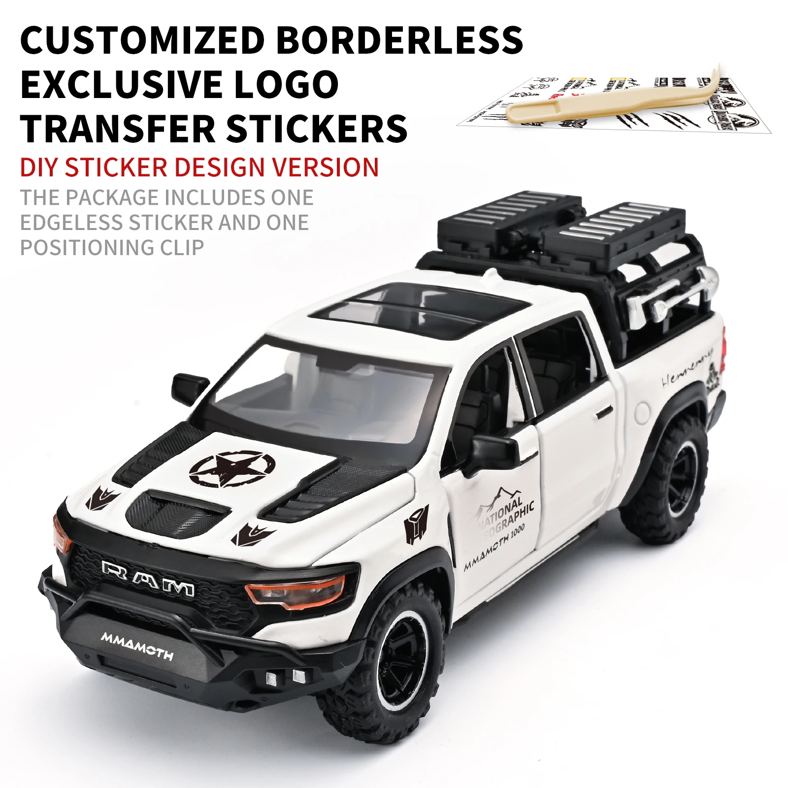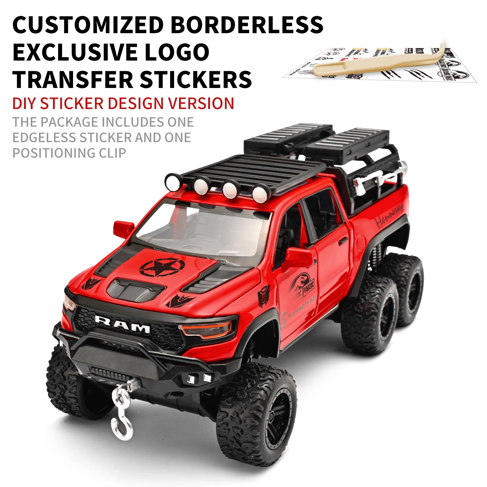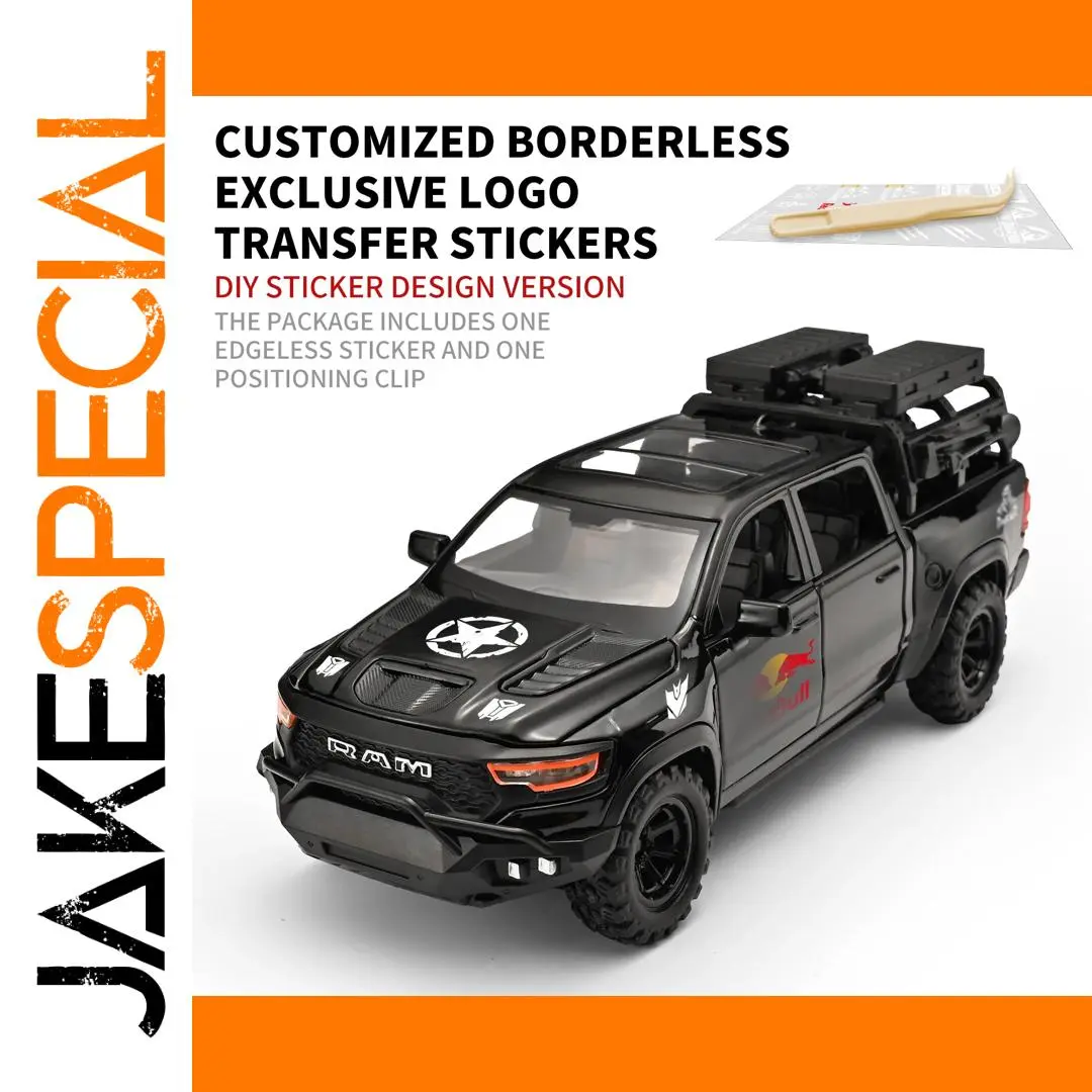 - The detailed design boasts prominent grille with bold “RAM” lettering, white star decal on the hood, “Red Bull” side decals, and proportionate side mirrors, capturing the rugged, military-inspired aesthetic.