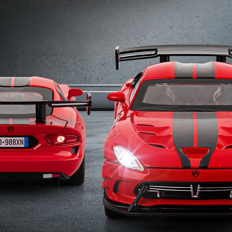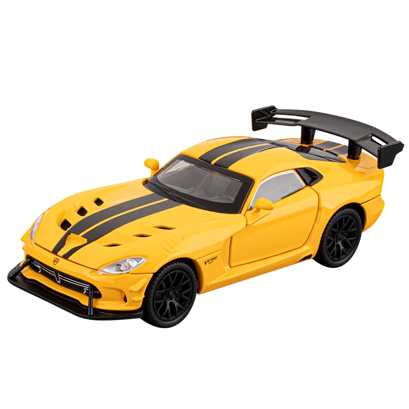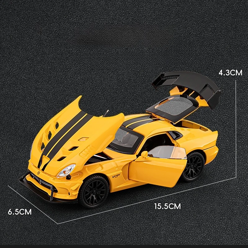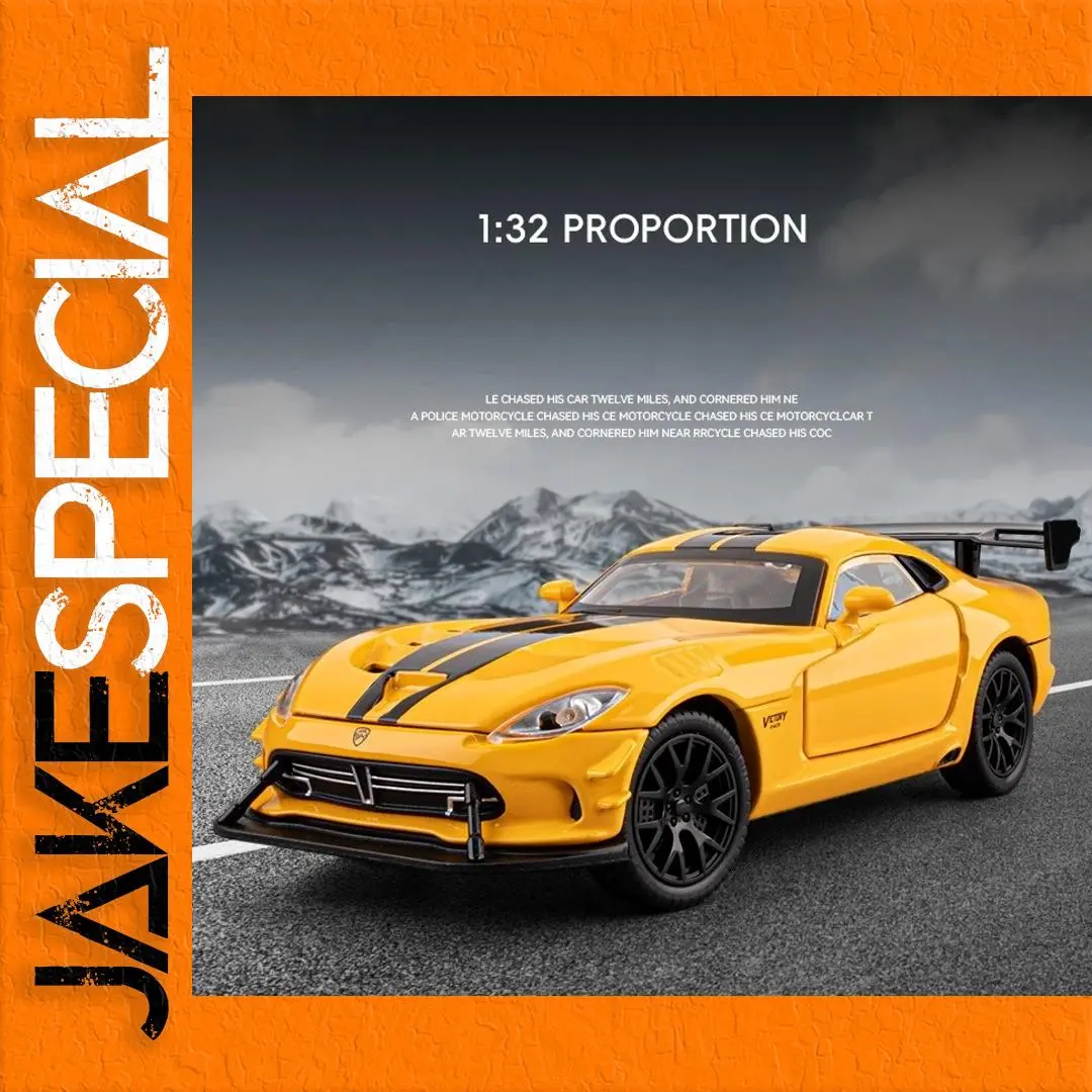 Imagine owning a stunning 1/32 scale diecast model of the iconic Dodge Viper sports car! Finished in a captivating bright yellow, this collectible showcases the stylish design and performance of the original vehicle. With its sleek curves and aggressive lines, it embodies the essence of sports cars. The model features distinctive black racing stripes, an intricately crafted front grille, and robust multi-spoke alloy wheels. Designed for adults and enthusiasts, this high-quality product brings the adrenaline of racing into your collection. Dive into the world of automotive excellence with this impressive piece that captures remarkable details, making it a must-have for any car lover.