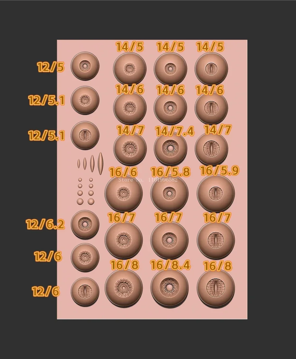 - Numerical dimensions indicated for precision in eye sizes.
