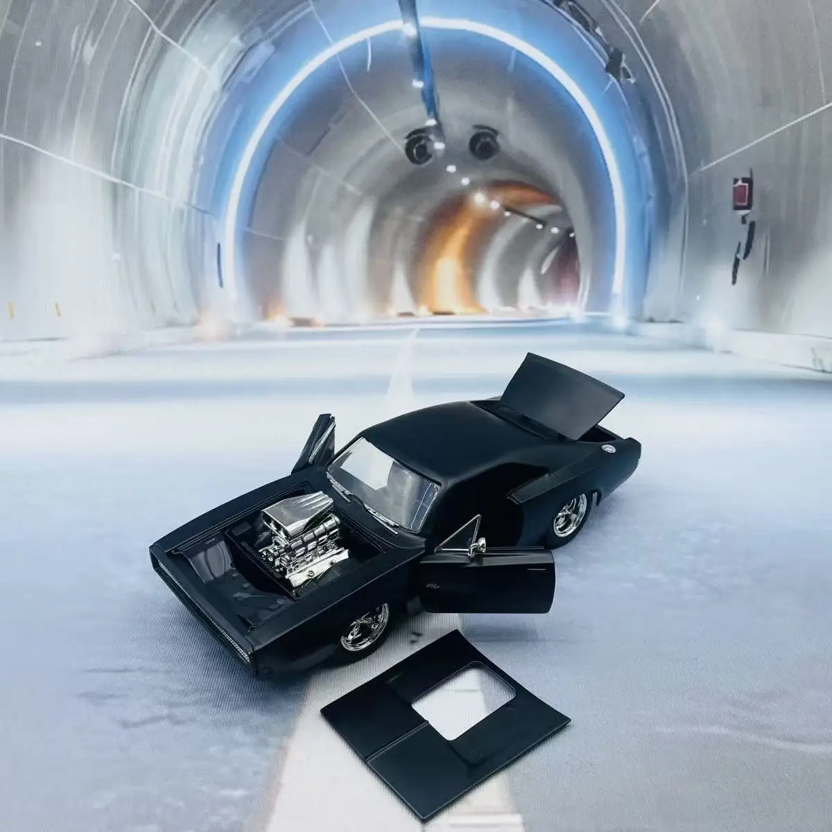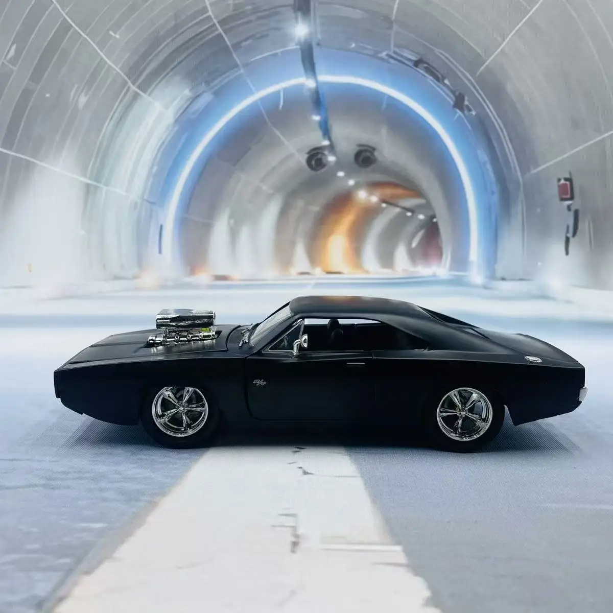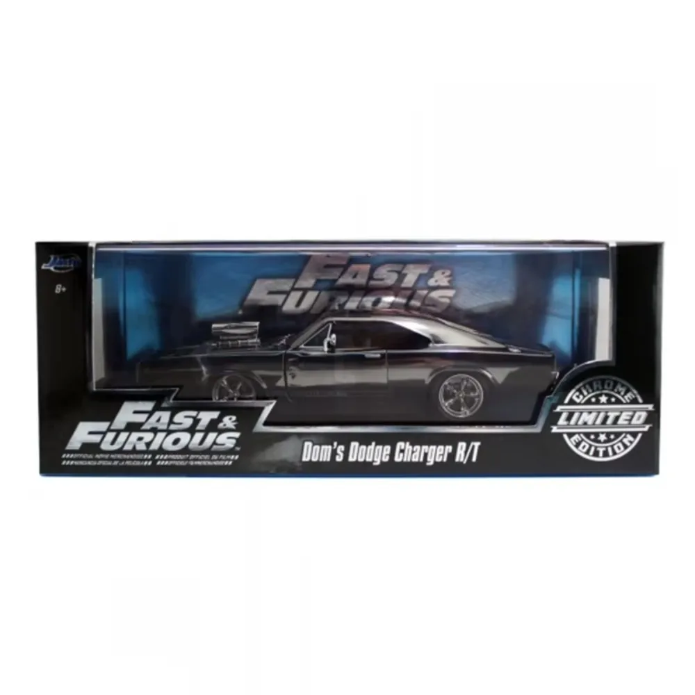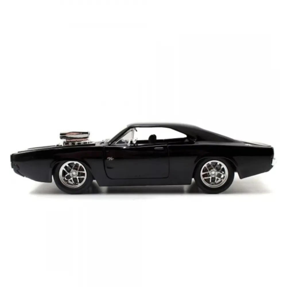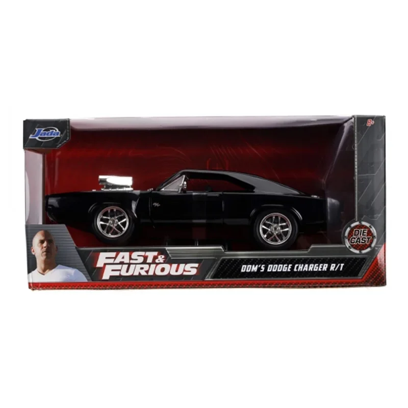 Immerse yourself in the world of iconic muscle cars with this exquisite 1:24 scale diecast model of Dom's 1970 Dodge Charger R/T. Finished in a striking glossy black, this collectible captures the essence of the classic vehicle with intricate detailing, including a prominent grille with mesh design and an oversized chrome supercharger featuring three cylindrical intakes. Crafted from durable metal, this model symbolizes both quality and aesthetic appeal, making it a perfect addition to your collection or a unique gift for automotive enthusiasts aged 14 and above. Picture this model proudly displayed, evoking admiration from fellow fans of the Fast Franchise.
