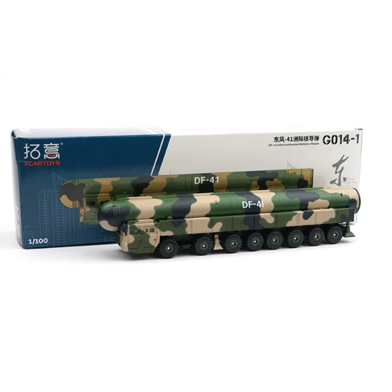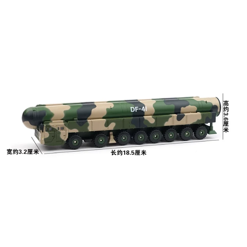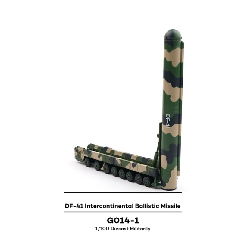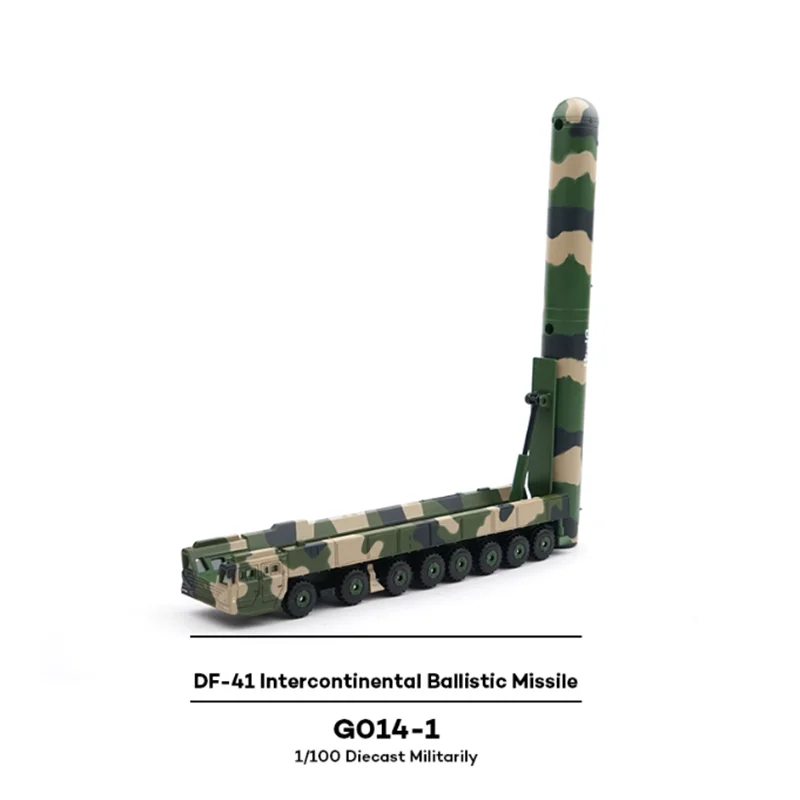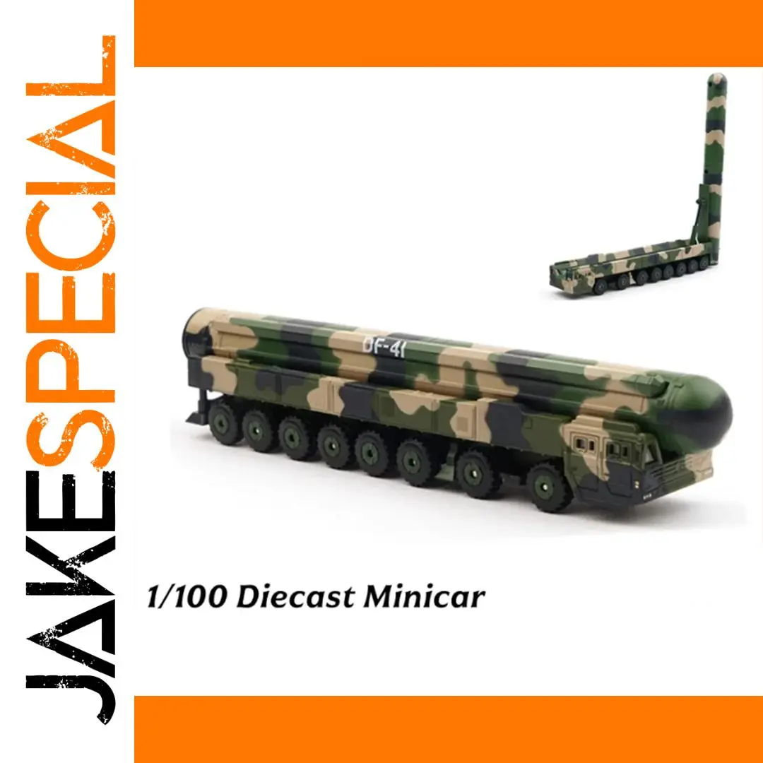 This highly detailed 1:100 scale alloy diecast model of the Dongfeng-41 intercontinental ballistic missile launcher vehicle offers a rugged military aesthetic with a camouflage pattern of green, tan, and black. It features an elongated body, realistic exterior panel lines, a rounded front cab with visible windows, and a multi-axle wheeled chassis with black tires and matching green hubs. The model includes a tall, slender, detachable missile silo painted in matching camouflage, emphasizing its authentic and commanding appearance. Designed for adult collectors, it’s a static display piece crafted with intricate detail, measuring approximately 1:100 in scale, perfect for collection or decoration. Minor scratches and shipping imperfections may occur.