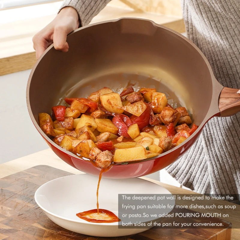 - Vibrant red exterior combined with a sleek, glossy finish enhances aesthetic appeal, complemented by the ergonomic wooden-look handle for a comfortable grip and reduced hand fatigue.