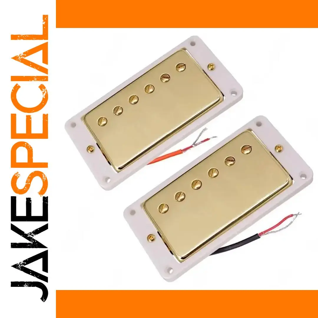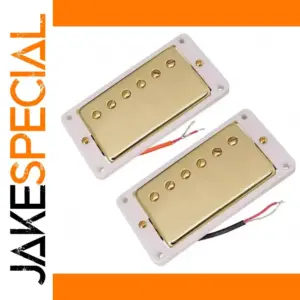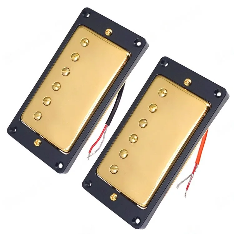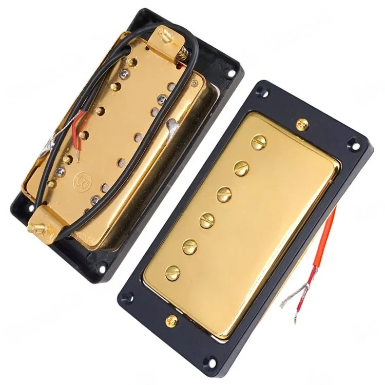 Imagine upgrading your guitar with this sleek double coil pickup, offering a premium look and sound. Featuring a polished gold cover with a subtle curvature, it exudes modern professionalism. Supported by a clean white or cream-colored plastic base, these pickups integrate seamlessly into your guitar's design. The precise placement of six small screw holes along the top enhances both aesthetic appeal and ease of installation. The black and orange insulated wires add a splash of color, emphasizing quality craftsmanship. Designed for comfort and durability, this pickup set enhances tonal clarity and sustain. Perfect for LP-style guitars or similar models, you'll instantly notice improved sound quality, making every practice or performance more enjoyable and inspiring.