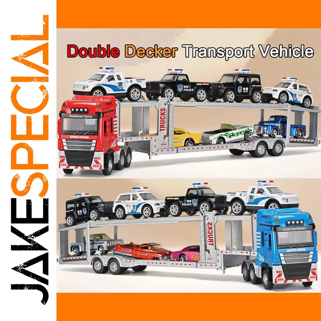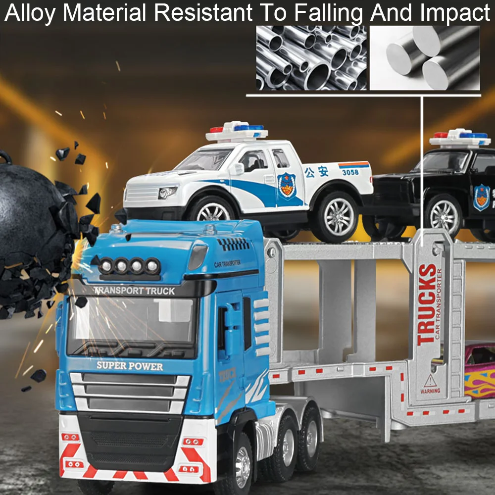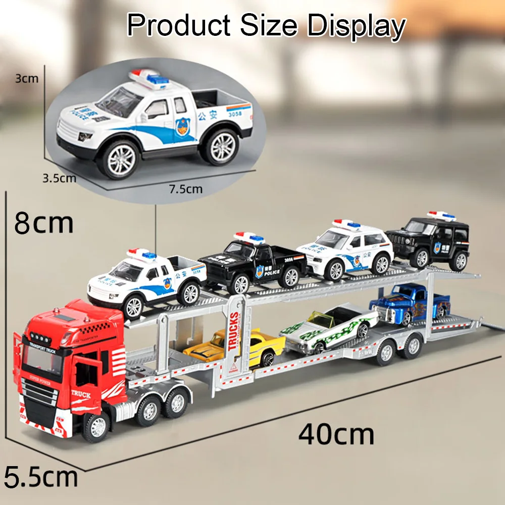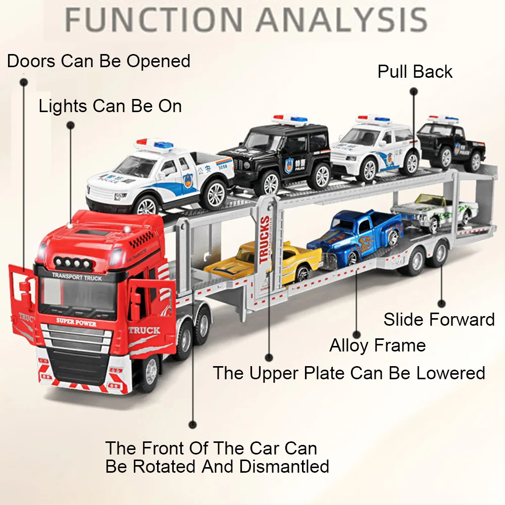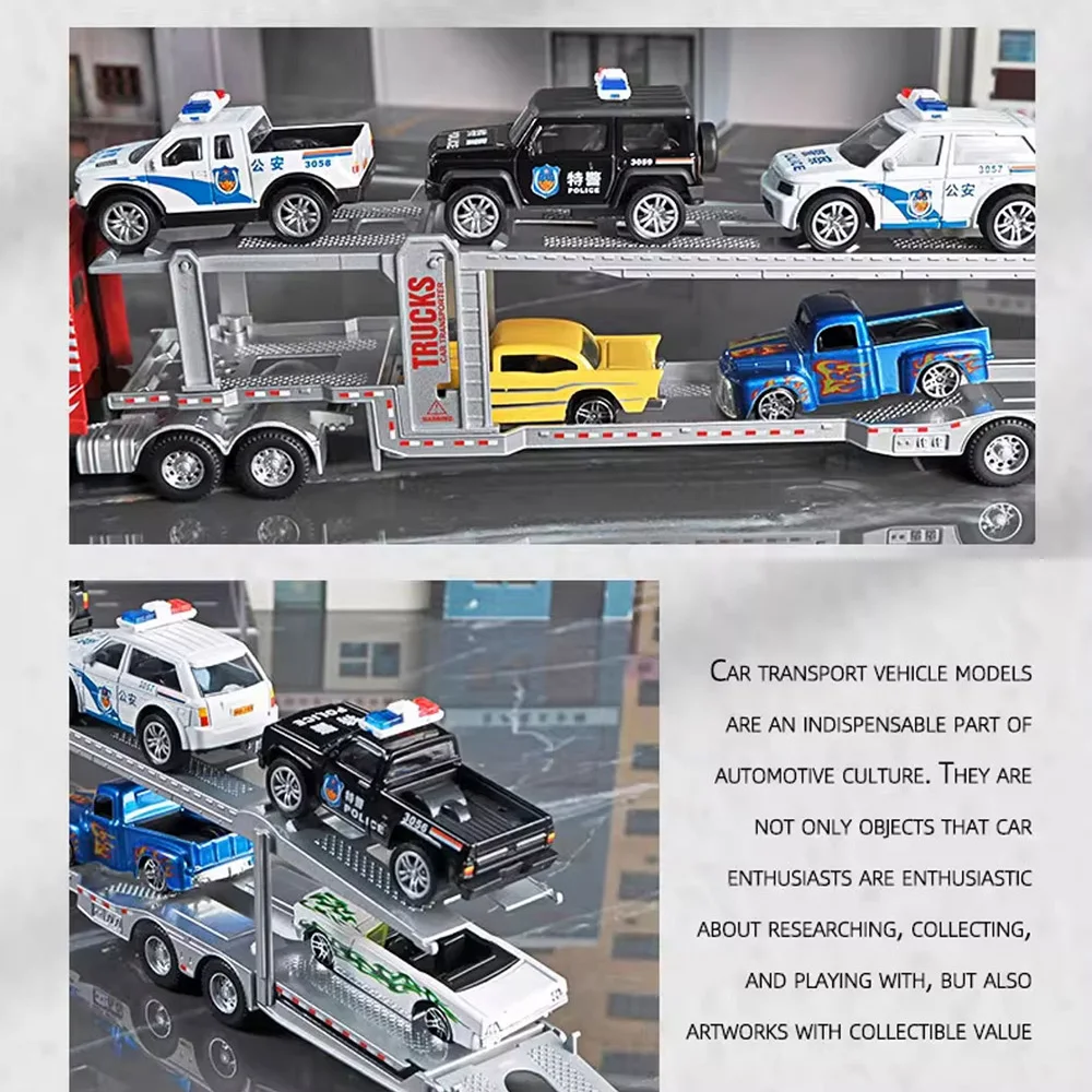 Imagine adding a vibrant and realistic miniature to your collection that captures the essence of modern cargo transport. Crafted with precision, this 1:48 scale diecast model features a striking red or blue zinc metal body, complemented by a plastic chassis and durable rubber tires. Its sleek design showcases an authentic heavy-duty truck with detailed grille and realistic wheels, making it a standout display piece. The transport section is a metallic silver, equipped with safety rails and a lightweight open-frame layout, perfectly supporting small, colorful cars. Enhanced with light and sound functions, this model offers an engaging, lifelike experience. Its sliding mechanism and strong build ensure long-lasting enjoyment for enthusiasts and collectors alike.