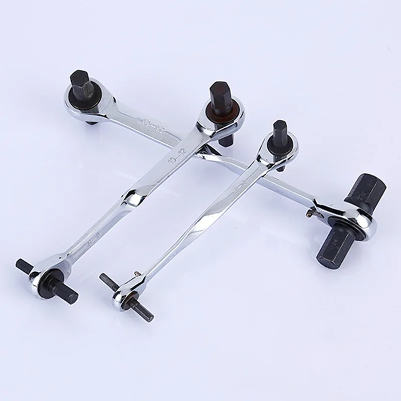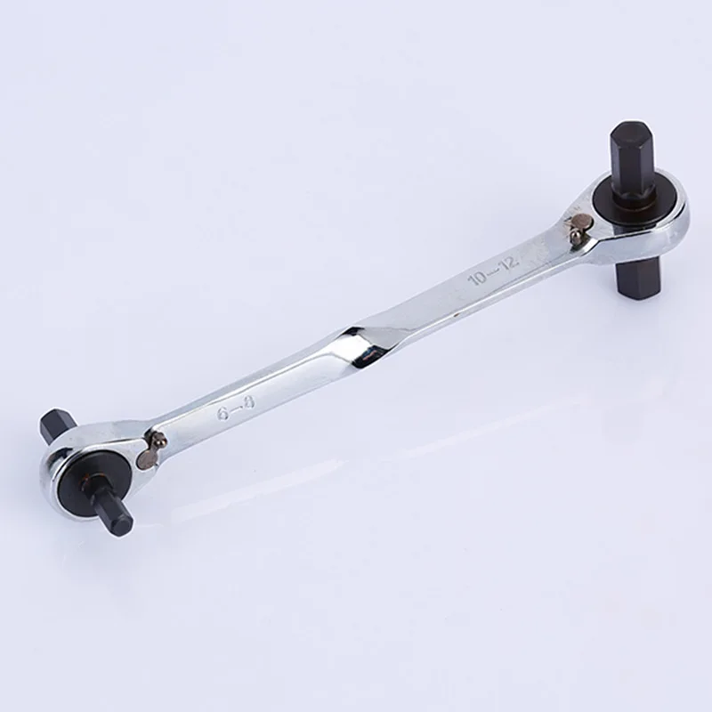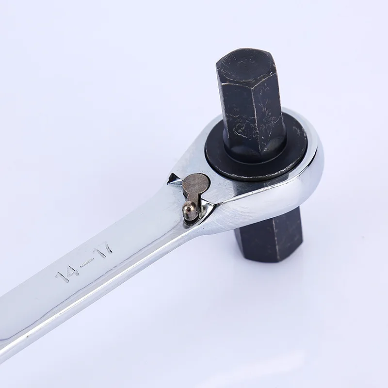 Experience precision and reliability with this high-quality double-end ratchet wrench. Crafted from robust chrome-molybdenum steel, it offers exceptional durability for demanding metalworking tasks. Its sleek, shiny finish not only provides corrosion resistance but also adds a professional aesthetic. The wrench features an ergonomic crank handle that allows for comfortable manual operation, reducing fatigue during extended use. Its versatile, double-ended design provides multiple sizes in a single tool, making it ideal for various bolt and nut dimensions. Whether you're working on intricate metal projects or heavy-duty repairs, this wrench ensures a secure fit and smooth ratcheting action. Its compact yet durable form makes it indispensable for metalworkers, mechanics, and DIY enthusiasts seeking precision and efficiency in their work.
