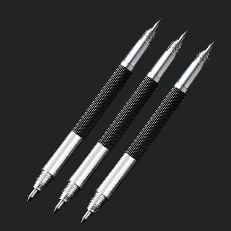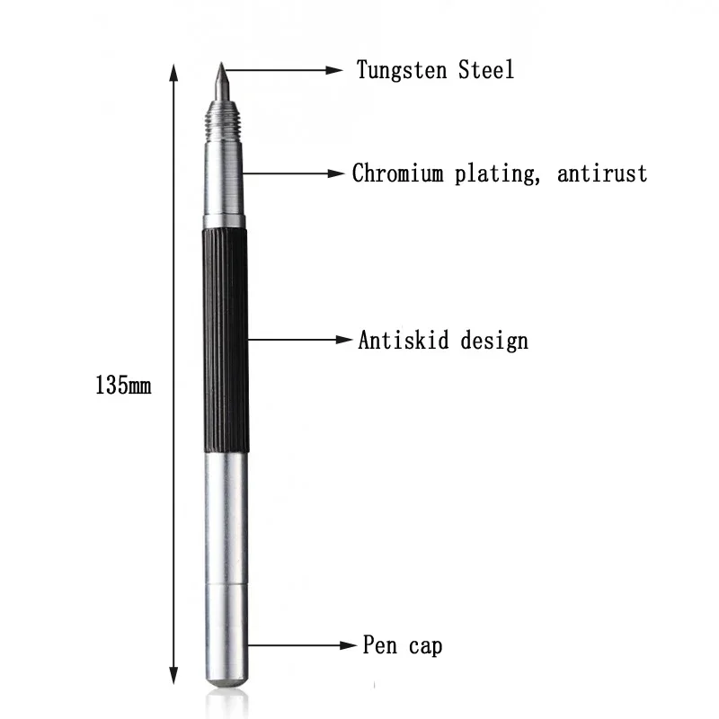 Enhance your engraving and marking tasks with this double end tip scriber. Measuring 135mm in length, its elegant, pen-like design ensures comfortable handling, making it an essential tool for artists and craftsmen alike. The sleek black handle is ribbed for grip and features shiny metallic alloy steel ends, exuding modern sophistication. Each end sports a conical tungsten steel tip, perfect for meticulous detailing on materials such as ceramics, glass, and metals. Whether you're personalizing gifts or creating intricate designs, this scriber blends functionality and aesthetic appeal seamlessly to meet your needs.