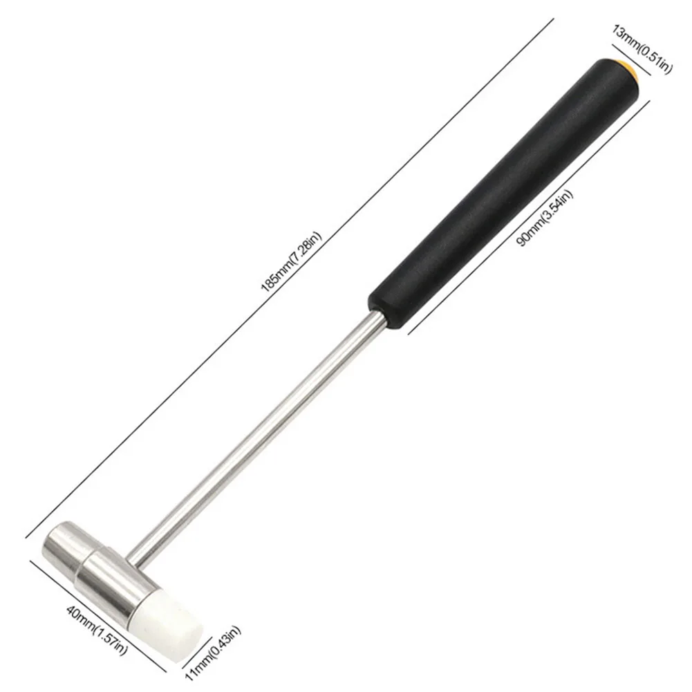 This double-faced soft rubber tap hammer, crafted from metal and plastic in a sleek silver finish, measures approximately 150mm, 177mm, 185mm, and 198mm, providing perfect portability. Its ergonomic, non-slip handle ensures a secure grip during delicate crafts like jewelry making, leatherwork, woodworking, and watch repairs. Featuring a versatile double-headed design with a metal side and a rubber side, this precision tool is ideal for detailed tasks, offering durability and reliability for professional and hobbyist use. Compact yet effective, it enhances your craftsmanship with its lightweight construction and functional design, making it an essential addition to your toolkit.