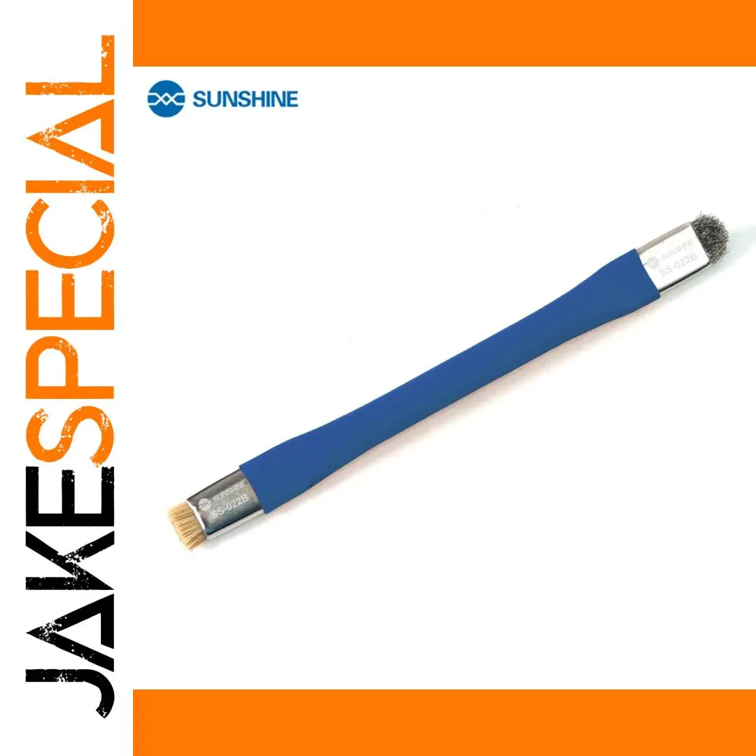 Experience precision cleaning with this this double-headed cleaning brush, specially crafted for electronic and mobile phone repairs. Its sleek stainless steel handle is complemented by a vibrant blue anti-static rubber sleeve, providing excellent grip and durability. The brush features two types of bristles: soft, dense beige ones for delicate tasks like cleaning IC pads and removing glue from motherboards, and coarser, anti-static dark gray or black bristles for dust removal and cleaning around electronic components. Built to last, the tool resists deformation and hair loss even after repeated use. This dual-head applicator offers versatility, functionality, and a professional appearance, making your repair projects smoother and more precise with every application.
