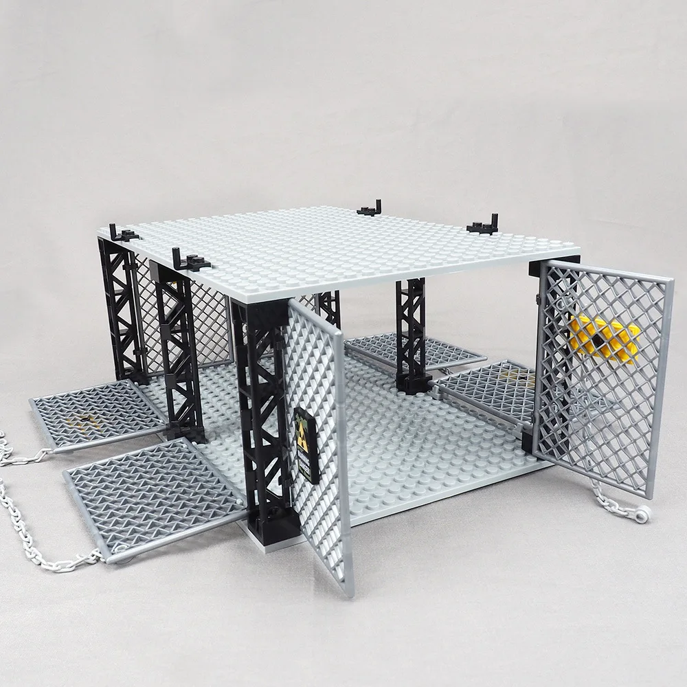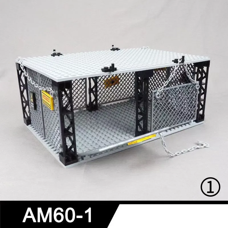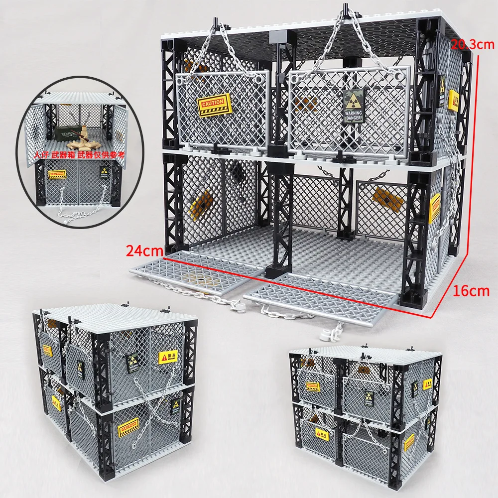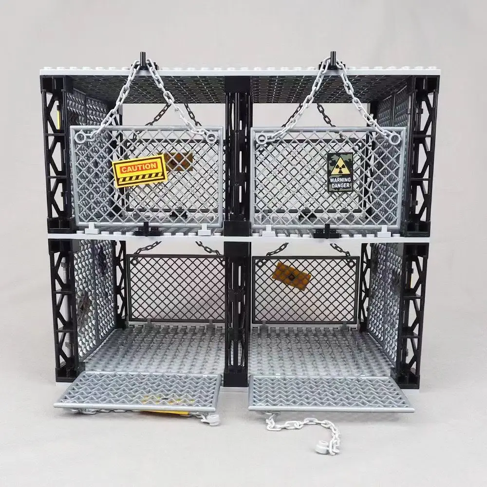 Experience endless imaginative adventures with this striking double-layer chainnet prison building set. Crafted from durable ABS plastic, it features self-locking bricks that ensure robust construction and safe play. The model showcases a bold black and white color scheme, with a rectangular design resembling a realistic prison cage, complete with detailed chainlink panels, gray detachable gates, hanging chains, and warning stickers that enhance its edgy, industrial aesthetic. Inside, miniature figures of a monster, zombie, and dinosaur add fun, creative storytelling options. Perfect for children aged 6-12, this set encourages problem-solving and imaginative role-play while offering a sturdy, safe, and visually captivating play experience. Its versatile design makes it suitable for other small block compatible toys as well.