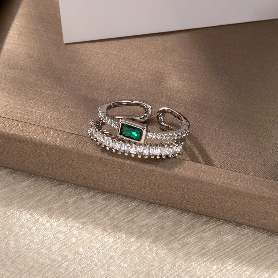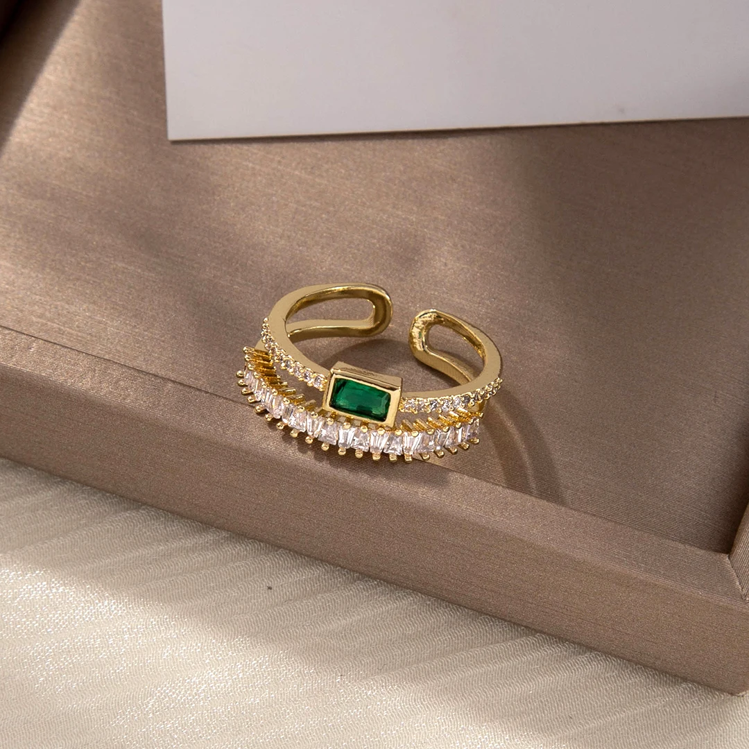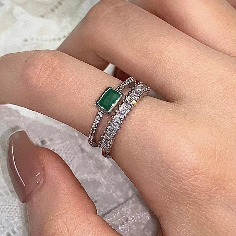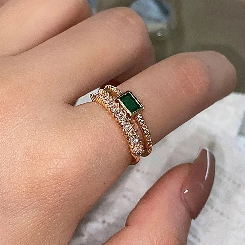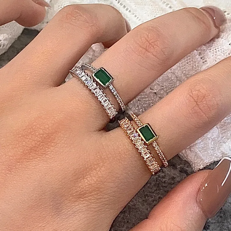 Enhance your style with these trendy double-layered geometric rings crafted from copper and coated with gold, featuring a sleek 2mm surface width and bezel-set design. Available in gold and silver tones, these versatile accessories showcase a modern vintage aesthetic with curved, minimalist lines, accented by small cubic zirconia stones along the outer edge. The gold-tone ring features a black rectangular bezel-set stone, while the silver-tone offers a green rectangular stone, adding bold color contrast. Perfect for fashion-forward occasions like parties or as minimalist bridal accessories, these finely crafted rings are designed to elevate your look with elegance and contemporary charm.