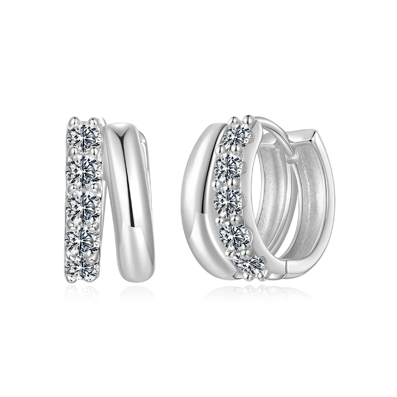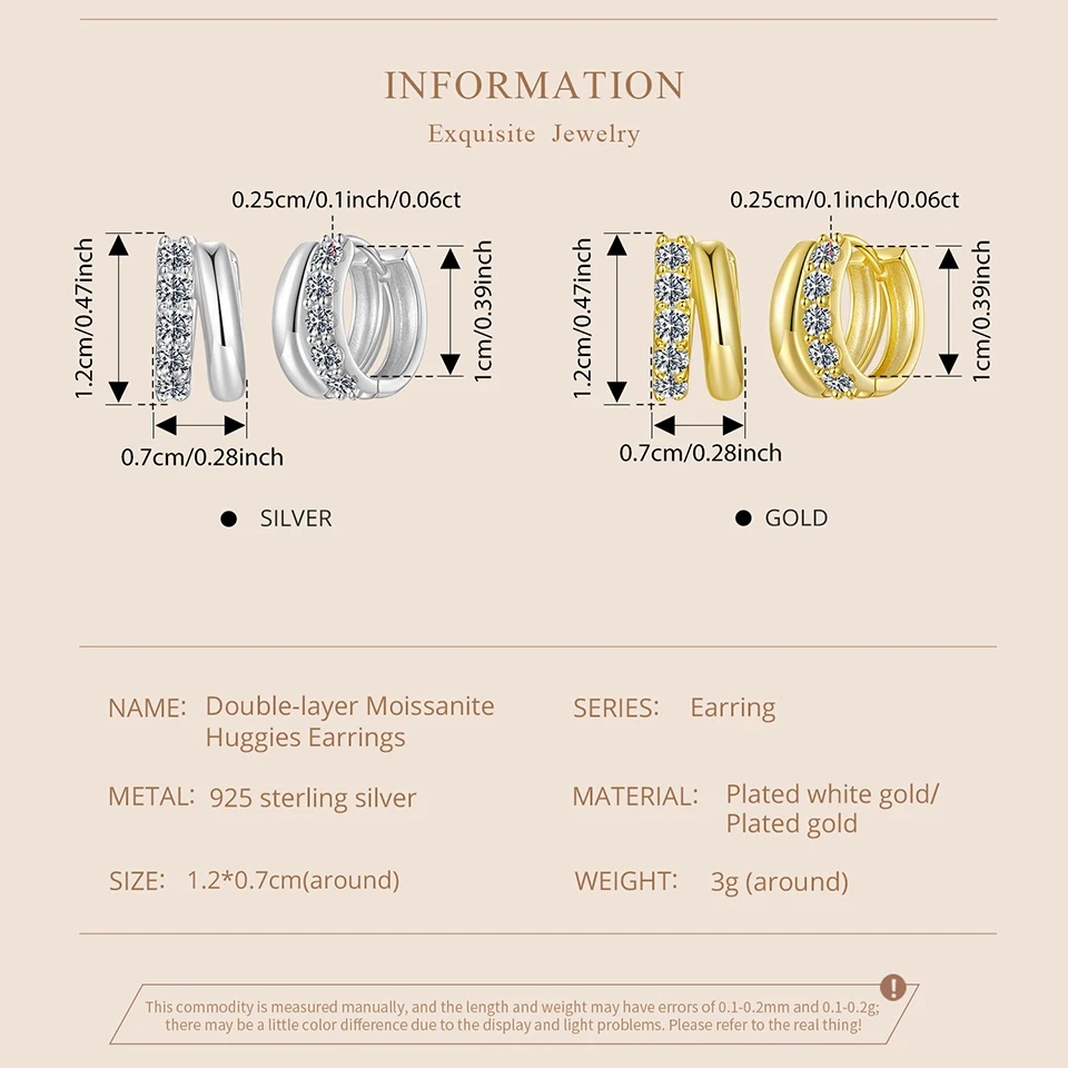 Discover the stunning craftsmanship of this double-layer Moissanite Huggies earrings designed exclusively for women. Crafted from 925 sterling silver and enhanced with platinum finish, these earrings blend sleek, modern style with luxurious sparkle. The set includes two smaller gold-toned hoops featuring a continuous row of luminous Moissanite stones, and a slightly larger silver-toned hoop adorned with multiple brilliant stones, creating a captivating interplay of shimmer. Each Moissanite stone measures 0.25 cm (0.06 CT), with a D color grade, EX cut quality, and VVS1 clarity. With an inner diameter of 1.0 cm and overall dimensions of approximately 1.2 x 0.7 cm, these earrings are petite yet eye-catching—perfect for weddings, anniversaries, or gifting your loved ones with a touch of elegance.