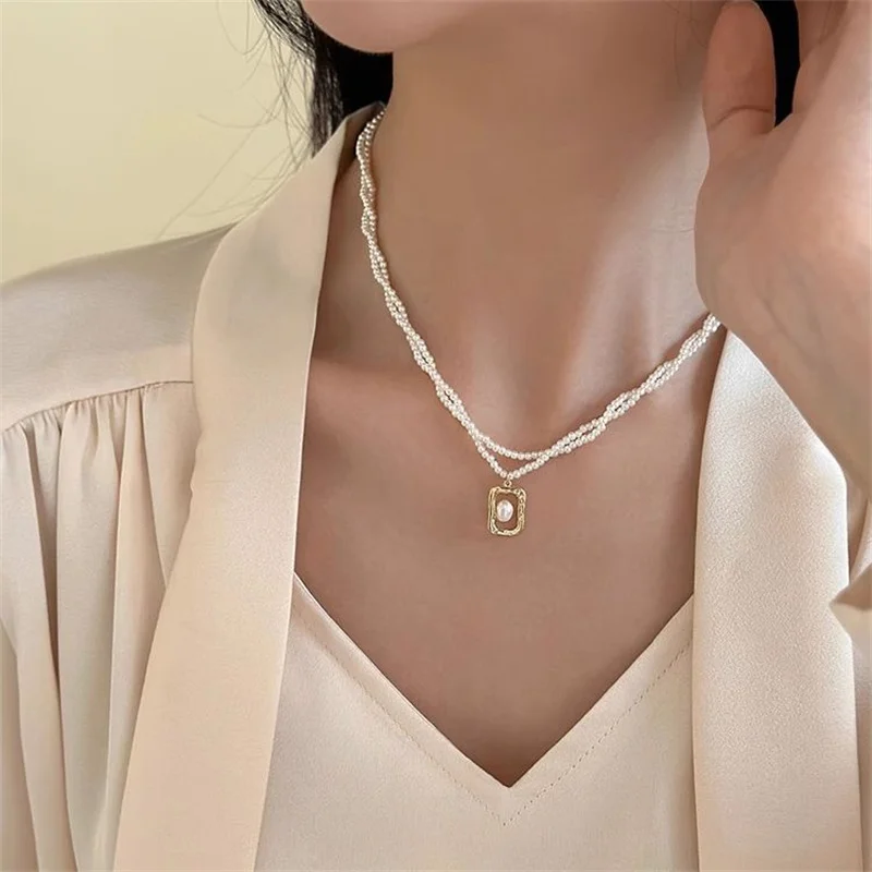Elevate your elegance with this double-layer fashion choker necklace, featuring two strands of lustrous, perfectly round simulated pearls and beads. The delicate square pendant, measuring between 1-5 cm, is framed in intricate gold-tone detailing, adding a romantic touch. Crafted from durable copper alloy available in multiple metal colors, this piece showcases a cute, feminine style perfect for anniversaries and special occasions. Its refined design enhances your natural grace, making it an ideal accessory to complement sophisticated or romantic outfits. Whether worn alone or layered with other jewelry, this necklace is sure to add a touch of elegance and charm to your collection.