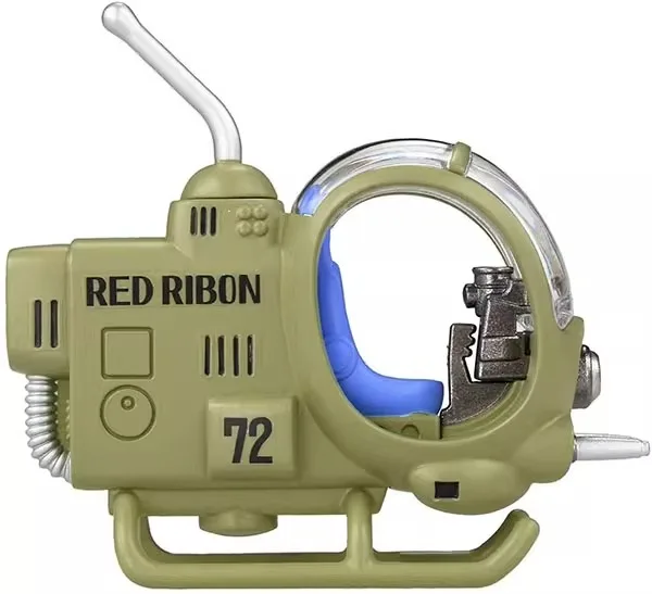 - Exterior details include bold black “RED RIBBON” text, small silver missile-like protrusions at the front underside, and a light gray antenna extending from the rear, enhancing the combat aesthetic.