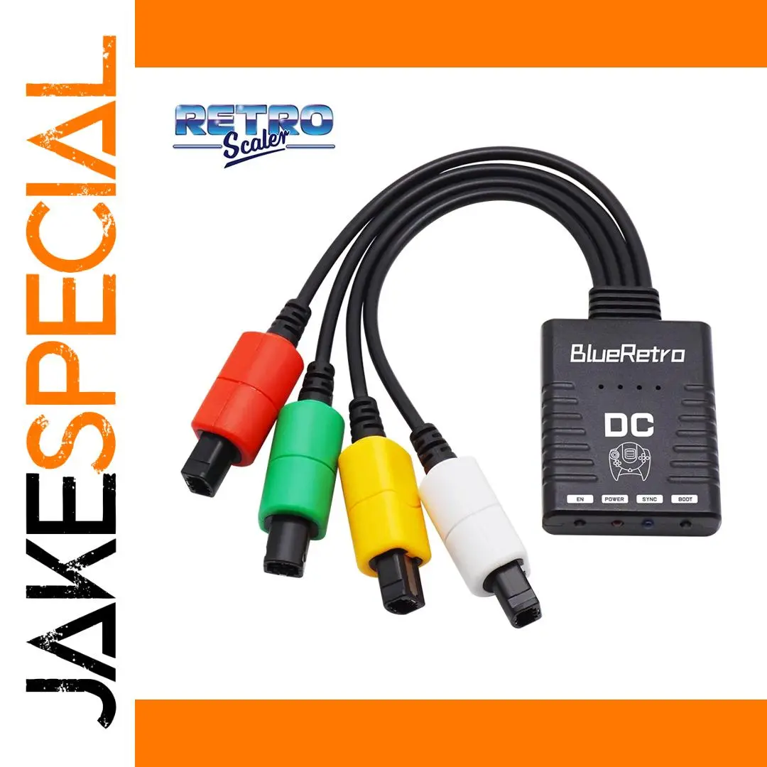 The RetroScaler BlueRetro Wireless Controller Adapter for Sega Dreamcast allows seamless connection of up to four Bluetooth controllers, supporting models like PS4, PS5, Switch Pro, Wii U Pro, Xbox Series X|S, Xbox One S/X, 8bitdo, and Retro-Bit controllers. Featuring a sleek black rectangular design with textured surfaces and horizontal ridges, it includes four LED indicators for power, Bluetooth status, and search mode, alongside multi-function buttons for reset, pairing, and configuration. Powered by an ESP32 chip, the adapter offers nearly zero latency (less than 6ms for PS4/PS5 controllers) and supports firmware upgrades via web Bluetooth with Google Chrome, providing a sophisticated and reliable gaming experience for Dreamcast enthusiasts.