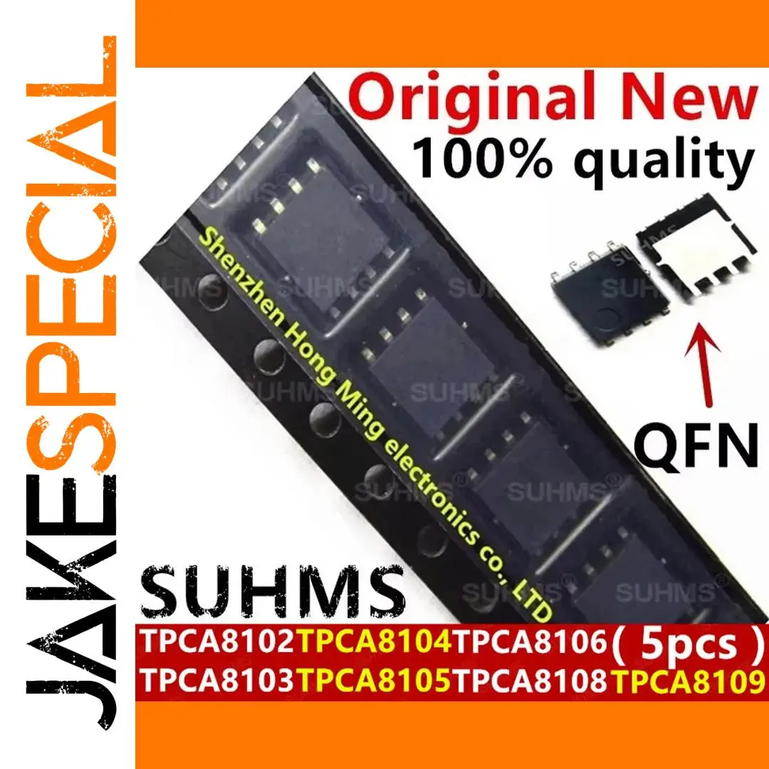 Experience seamless integration with this set of five new drive ICs, featuring models TPCA8102, TPCA8104, TPCA8106, TPCA8105, and TPCA8109. Designed for optimal performance in computer applications, these ICs boast a sleek black QFN-8 package with precise metallized contact pads on all four sides. Their compact, rectangular shape and flat surface give a modern, minimalist aesthetic, ideal for advanced electronic projects. Whether upgrading or designing new systems, these modules provide reliable, high-quality performance with standardized supply voltages and dissipation power. Their organized presentation and technical sophistication make installation straightforward. Invest in these original, high-grade components to ensure your circuitry remains stable, efficient, and professional-looking. Visualize your perfect setup with these sleek, reliable ICs integrated seamlessly into your system.