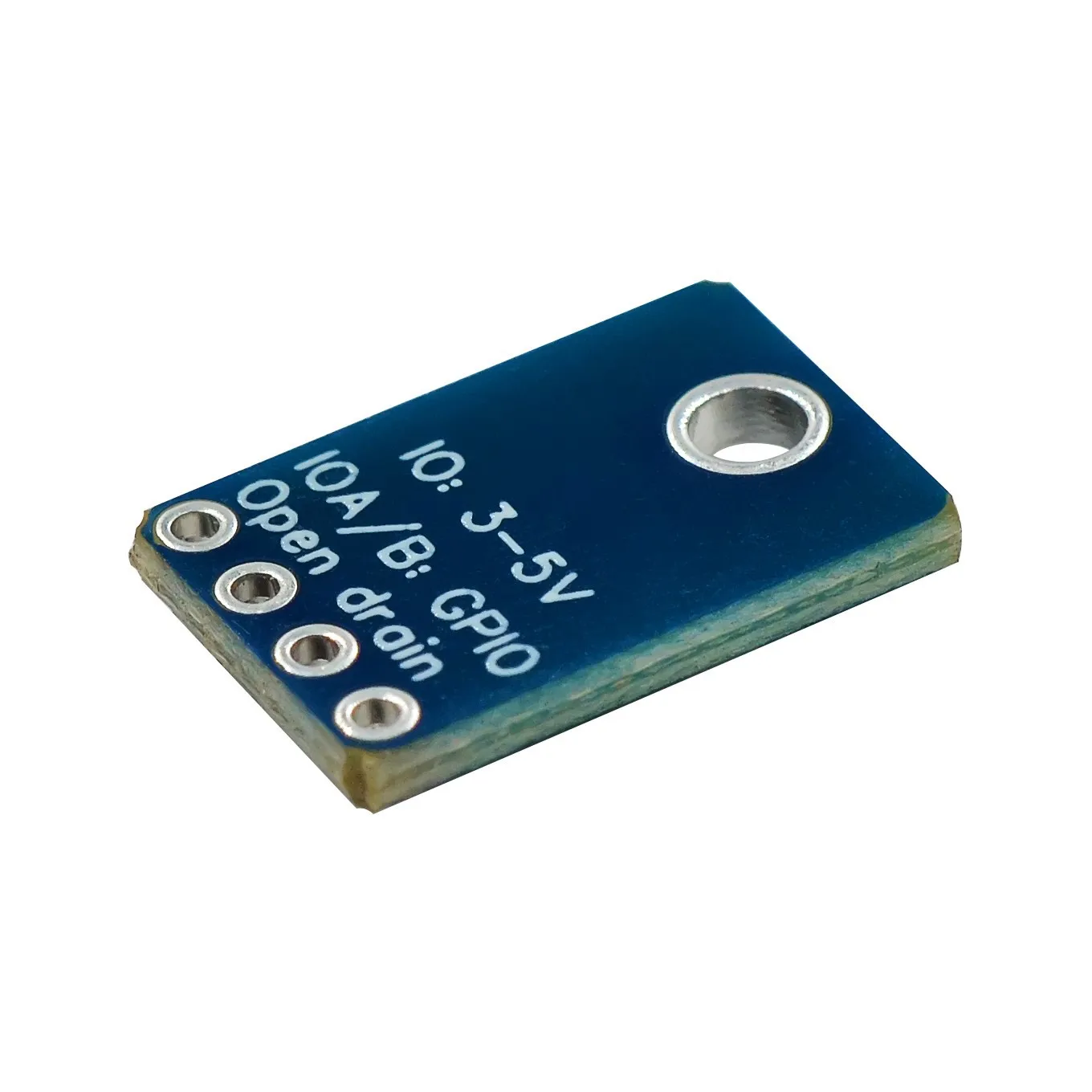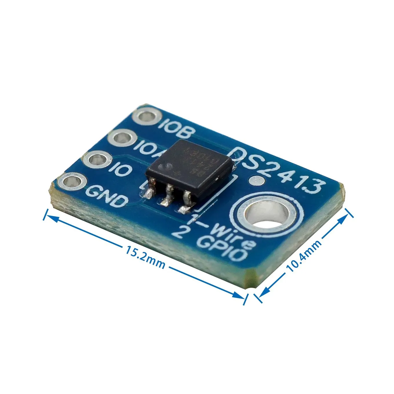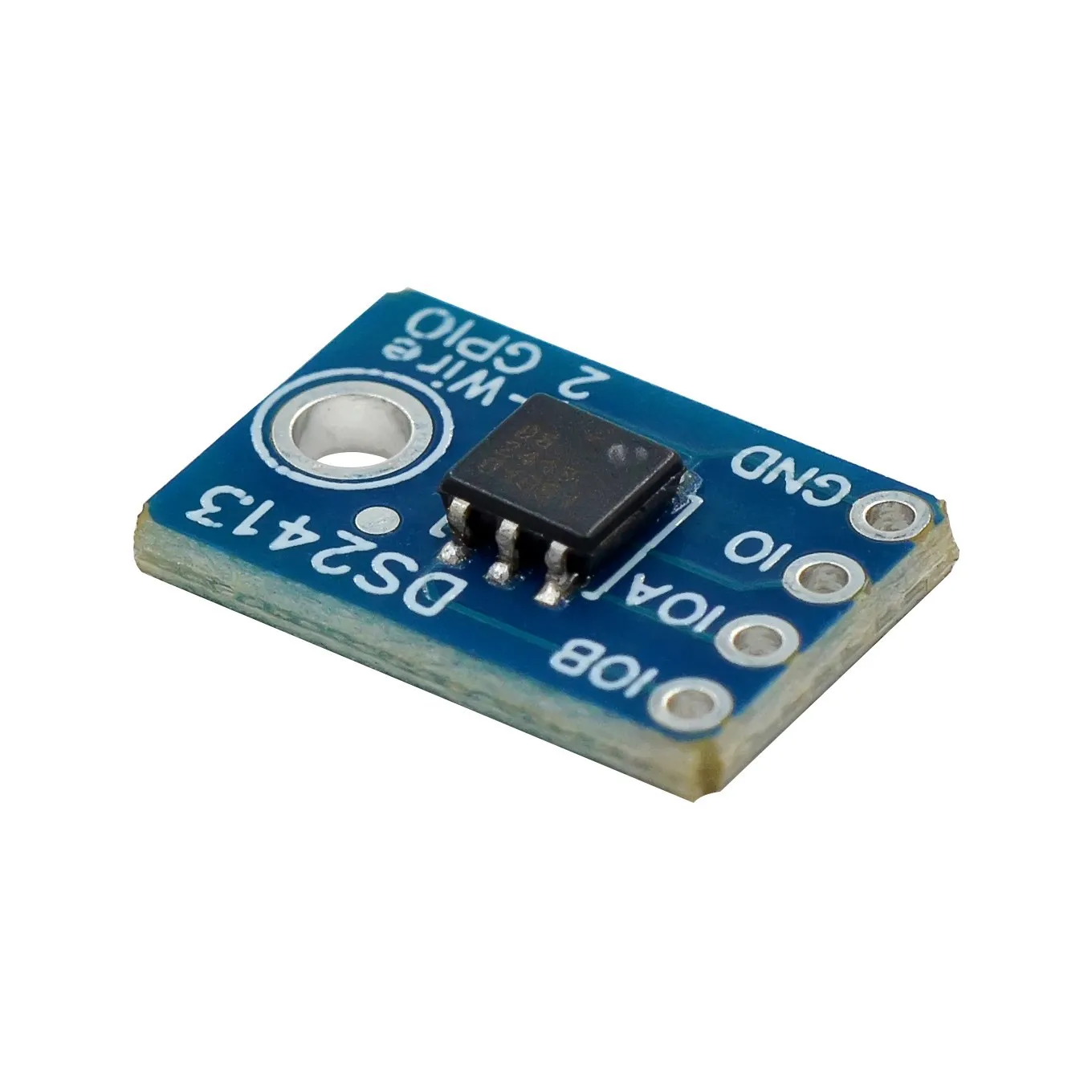Discover the versatility and streamlined design of this DS2413 single-wire double GPIO controller module. Featuring a vibrant blue PCB with a smooth matte finish, this compact device combines a minimalist aesthetic with technical precision. Its black integrated circuit centered on the board features metallic pins that provide a subtle metallic shimmer, contrasting beautifully with the vivid blue background. White silkscreen labels clearly mark each pin, adding to its clean, organized appearance. Four circular mounting holes at each corner give it a balanced, geometric touch, making it suitable for various electronic projects. Whether you're designing a smart system or enhancing your digital setup, this controller is the perfect blend of form and function, showcasing a modern, technical look that appeals to enthusiasts and professionals alike.