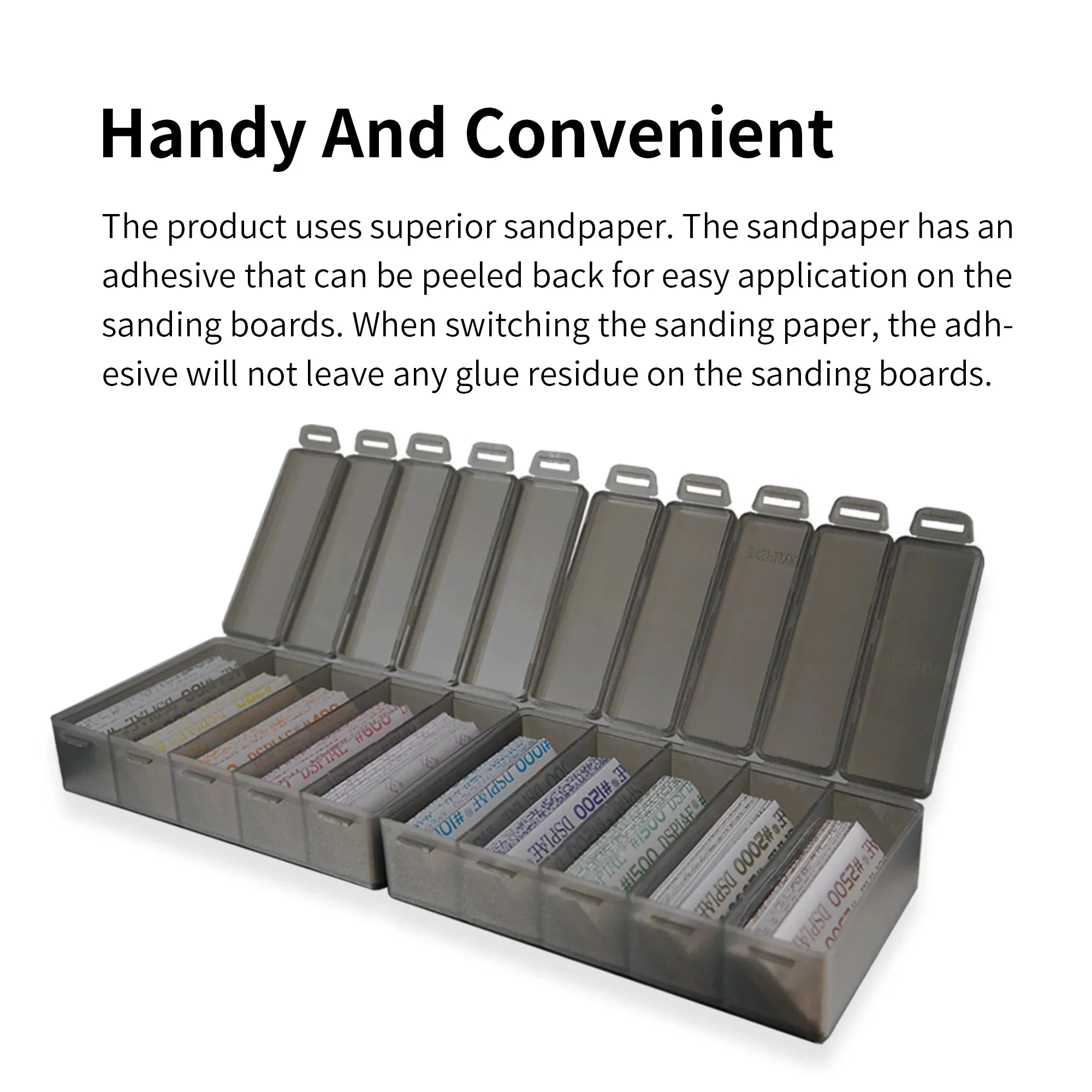 Elevate your model making with the DSPIAE SP-S Pre-Cut Self-Adhesive Sandpaper Set, featuring an array of grit levels from #200 to #3000. Experience the precision of color-coded strips, including light blue, turquoise, white, and yellow, designed specifically for sanding and polishing projects. Each strip exhibits a smooth, shiny finish and is crafted for effortless application, allowing you to achieve flawless results in your Gundam hobby or DIY endeavors. Embrace the ease and quality of these premium sanding tools, and let your creativity shine as you revamp and perfect your models with confidence.