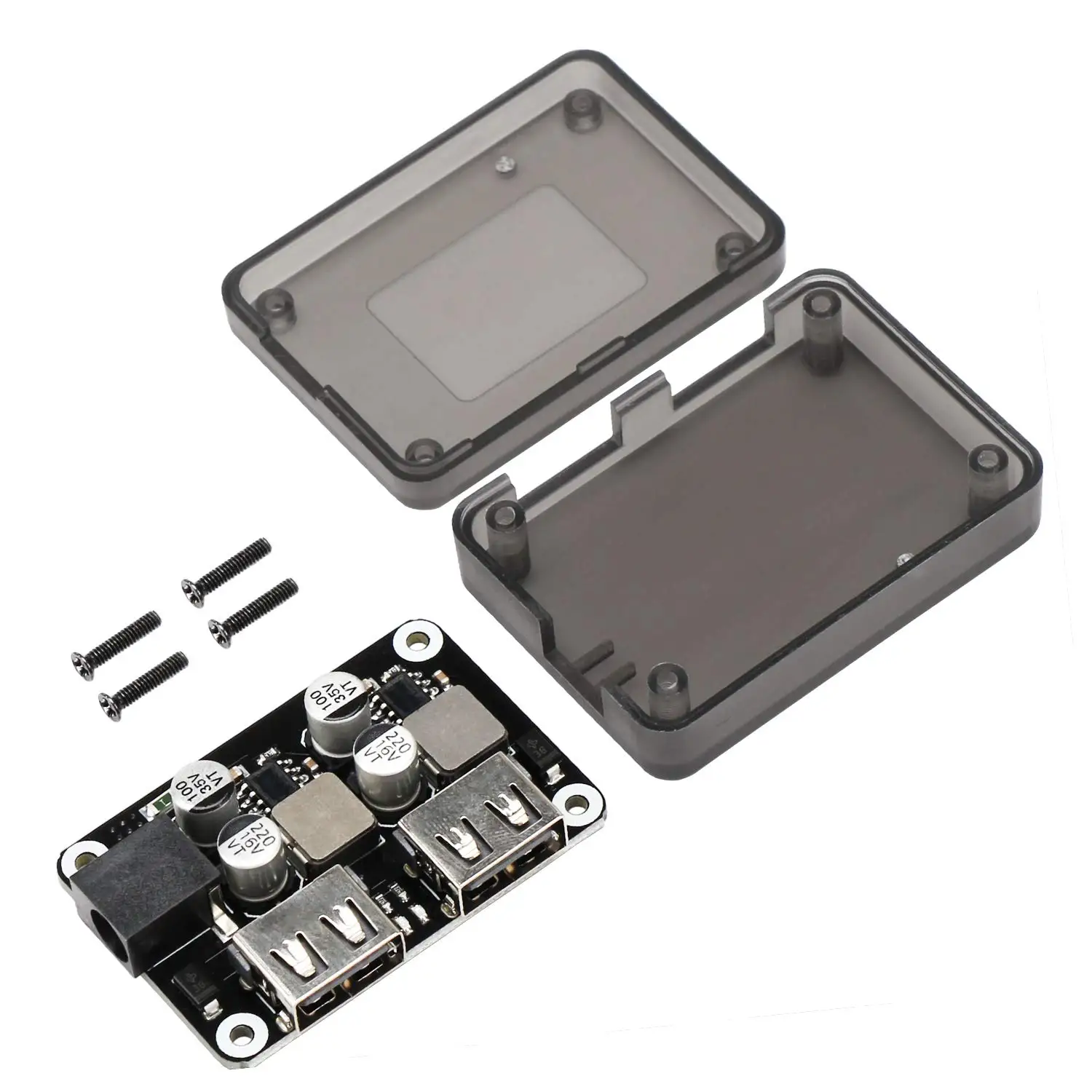 Experience reliable power conversion with this 12V to 5V DC USB buck converter, featuring dual USB ports capable of delivering up to 2.5A and 30W each for fast charging devices. Its sleek, rectangular design in semi-transparent black housing reveals internal components for a modern, industrial look. Equipped with over-voltage protection, input fuse, and support for protocols like QC 2.0, QC 3.0, MTK PE 1.1/2.0, AFC, FCP, and SFCP, it ensures safe and efficient power delivery. The device’s adjustable output from 3V to 12V, combined with its durable, compact build and rounded edges, makes it ideal for automotive or mobile power applications, integrating seamlessly into your setup.