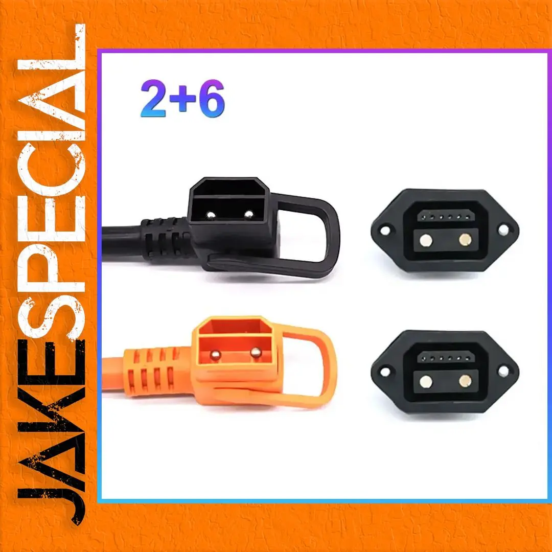 Discover this modern and functional dual 2+6 E-BIKE battery connector set designed for electric bikes. Featuring a sleek rectangular shape with rounded edges, these connectors combine practicality with an attractive industrial aesthetic. The black male connector offers a smooth matte finish that emphasizes durability, while the bright orange counterpart provides a vibrant visual contrast. Built with robust plastic housing and silver-plated copper contacts, they ensure high conductivity and resistance to corrosion. Both the male and female parts include mounting holes for secure installation and extend from flexible, strain-relief cables. Engineered for high-current and high-voltage applications, these connectors are IP67 rated, making them fully waterproof and dustproof, perfect for outdoor riding in various weather conditions.