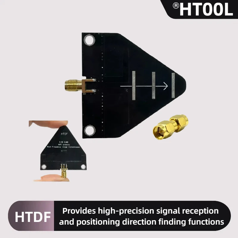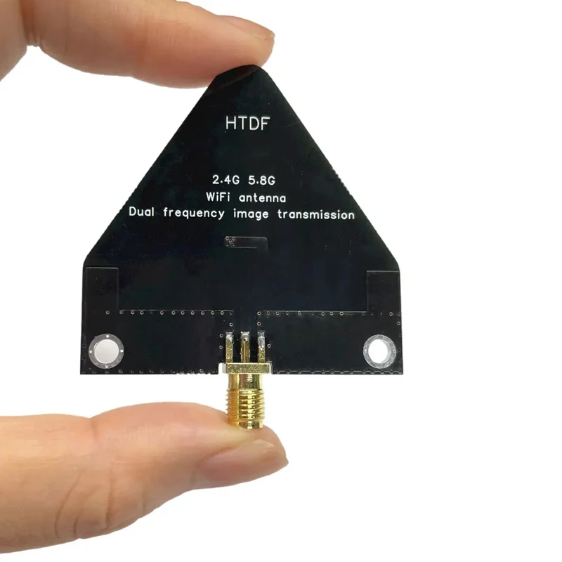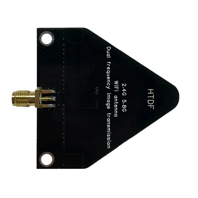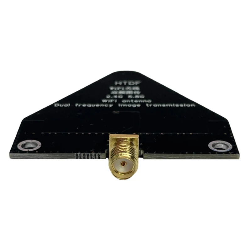 Experience the cutting-edge performance of this high-tech HTDF dual-band video transmission antenna, designed to deliver exceptional signal clarity across two critical frequency ranges: 2.35-2.55 GHz and 5.5-6.0 GHz. Its sleek, matte black exterior and complex triangular form provide a modern aesthetic while ensuring optimal aerodynamic performance. The antenna features three metallic silver brackets that reinforce its structure and add a sophisticated industrial touch. The gold-plated SMA female connector contrasts beautifully with the matte finish, symbolizing durability and high quality. Perfectly suited for spectrum analyzers, wireless monitoring systems, and scientific research, this antenna guarantees reliable, high-precision signal reception, enhancing your technical setup with style and efficiency.