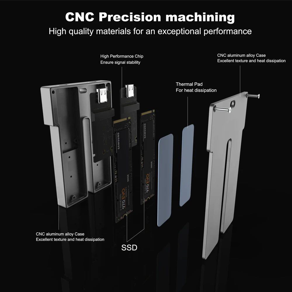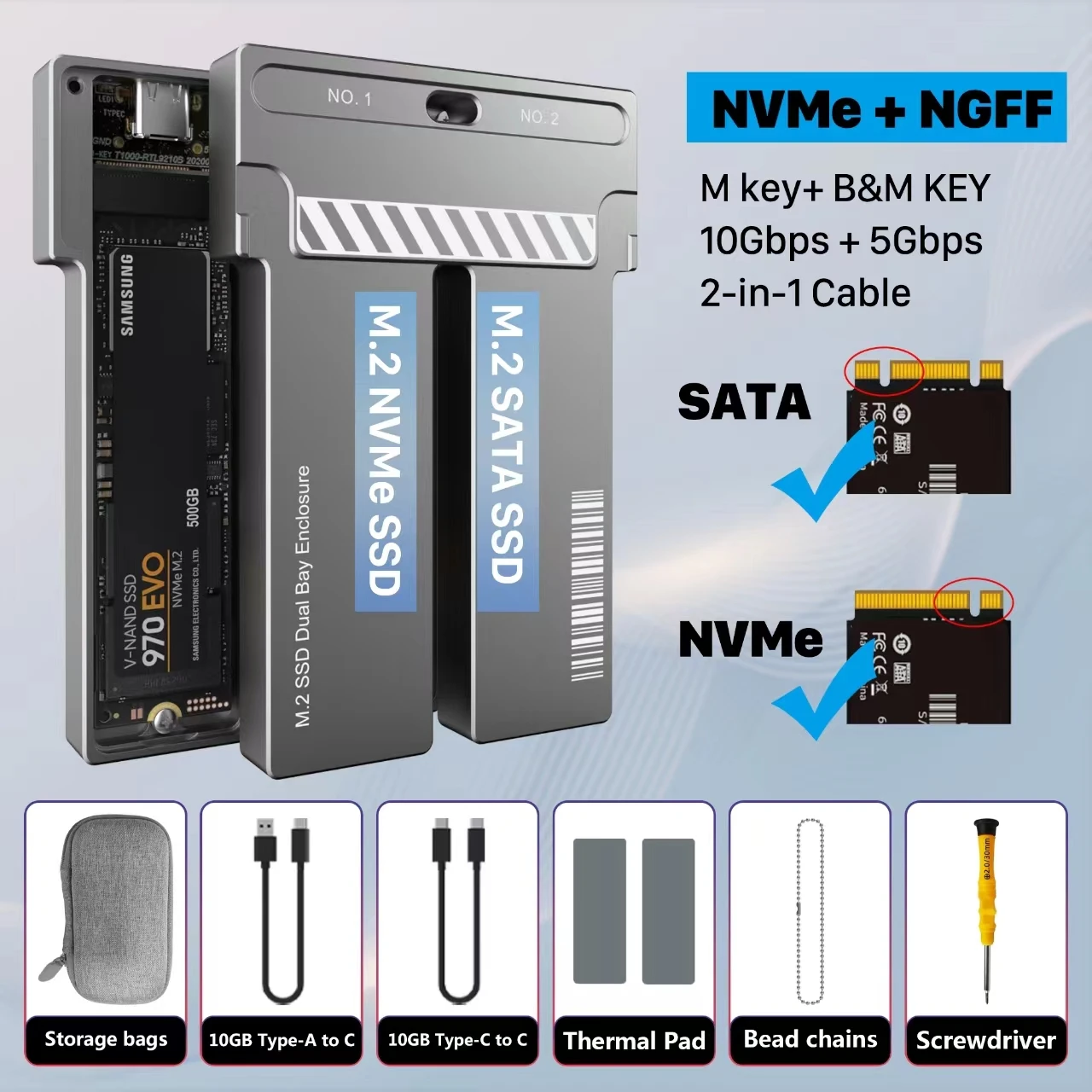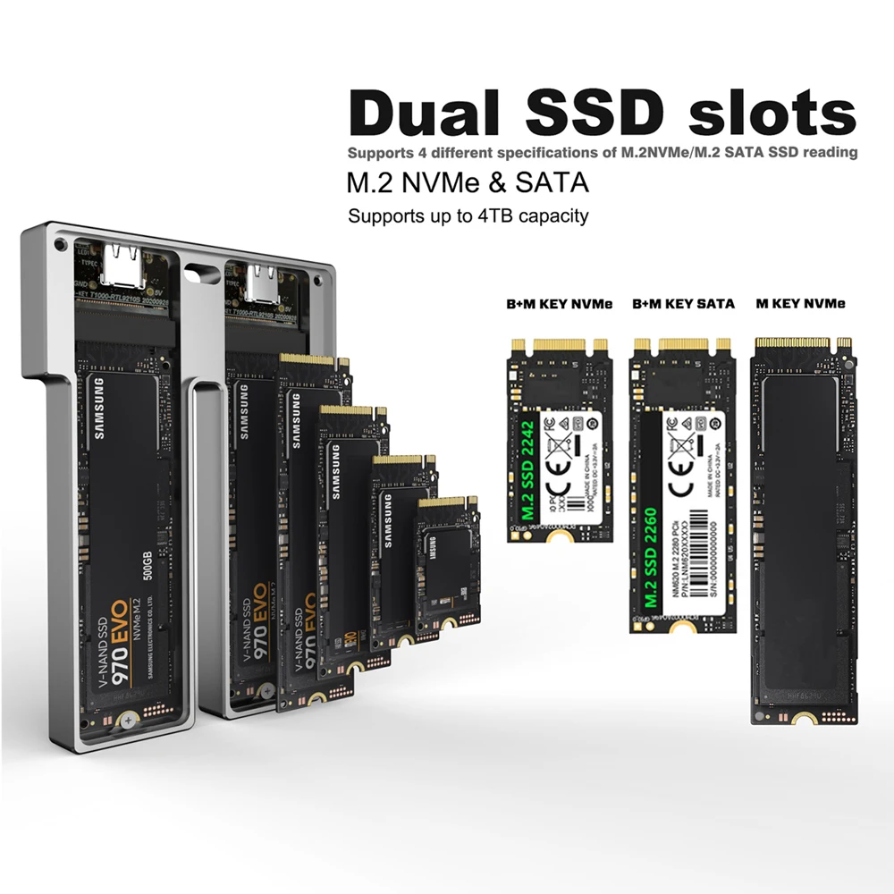 Imagine the convenience of expanding your storage effortlessly with this high-quality, stylish dual bay M.2 SSD enclosure. Whether you are backing up important files, expanding your gaming storage, or transferring data quickly, this device provides the reliability, speed, and ease of use essential for your projects. Its modern design seamlessly blends into professional setups, while its technical features ensure your SSDs operate at their best. Make your data management more efficient—invest in this durable, high-performance enclosure today and experience rapid, secure data transfer like never before!