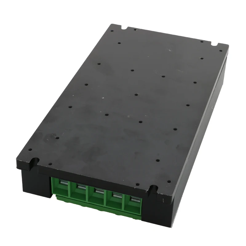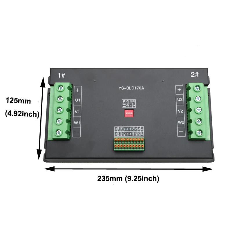 Experience seamless control with this dual-channel brushless motor controller, crafted with a modern, compact rectangular design finished in matte black. Its minimalistic aesthetic is complemented by crisp white labels and small symbols that enhance usability and clarity. The neatly organized terminal connections on both sides, featuring labeled screw terminals, reflect its precision engineering and user-friendly layout. A bright red rectangular component adds a subtle pop of color, highlighting its technical sophistication. Designed for practical applications like RC crawler vehicles, lawn mowers, and RC tanks, this controller not only looks professional but offers dependable performance. Its organized, industrial appearance conveys durability and efficiency, making it an ideal choice for advanced hobbyists seeking both style and functionality in their remote control projects.