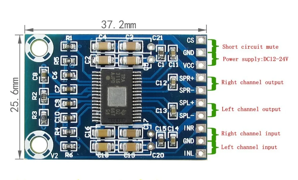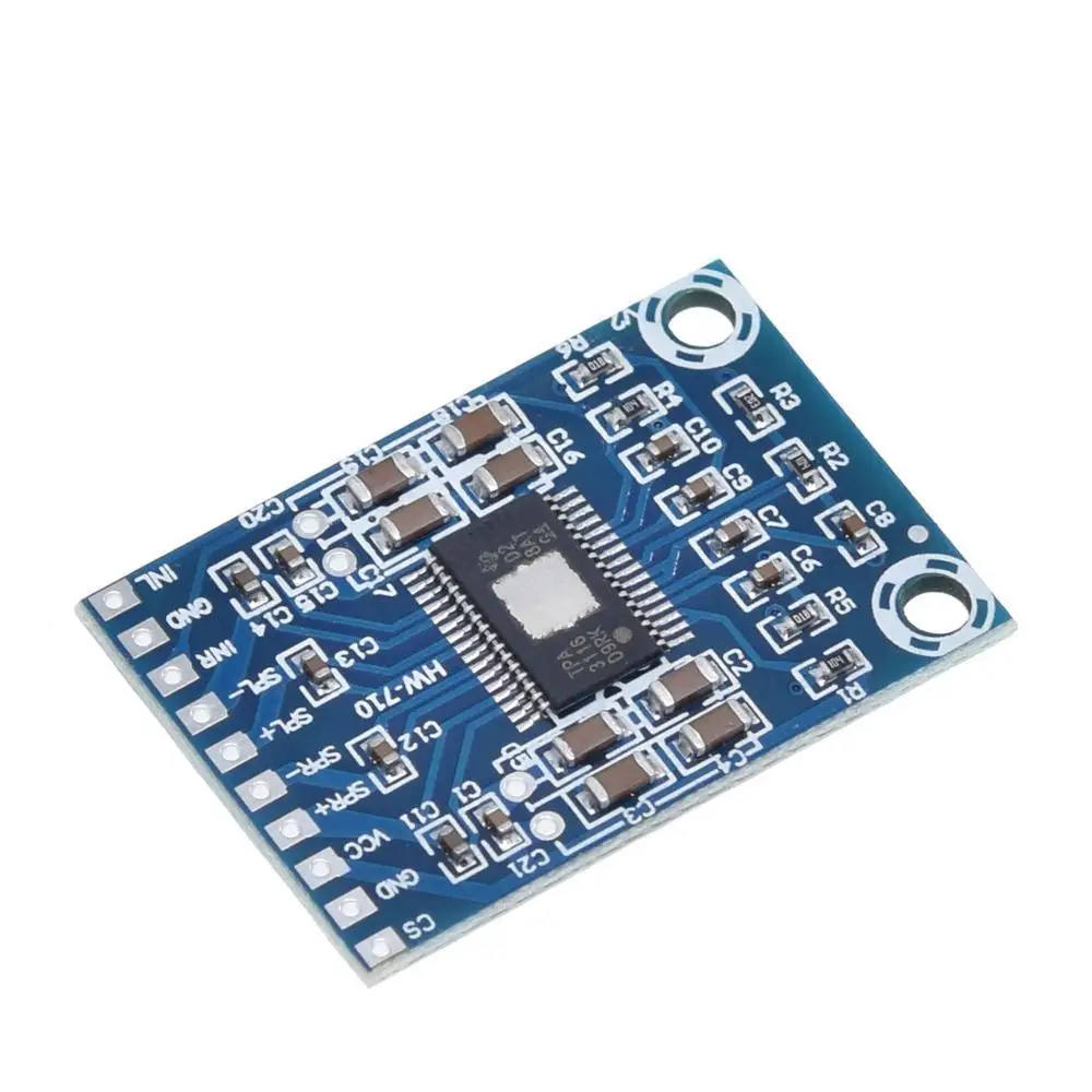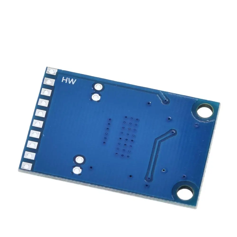 This dual-channel mini digital amplifier module featuring the TPA3116D2 chip delivers 50W per channel, with a total power output of 100W, operating on DC voltages between 12V and 24V. Its compact design measures 37mm in length and 25mm in width, optimized for high efficiency in class D digital amplification. Featuring a sleek blue PCB with white silkscreen markings, black integrated circuit, and neatly arranged surface-mounted resistors and capacitors, it offers a streamlined, professional appearance. Ideal for DIY audio projects, switches, sensors, and electronic applications, it operates reliably across a temperature range of -40°C to +85°C, making it a versatile choice for enthusiasts and professionals alike.
