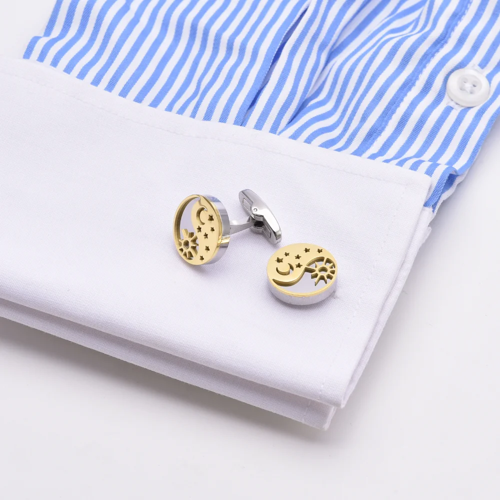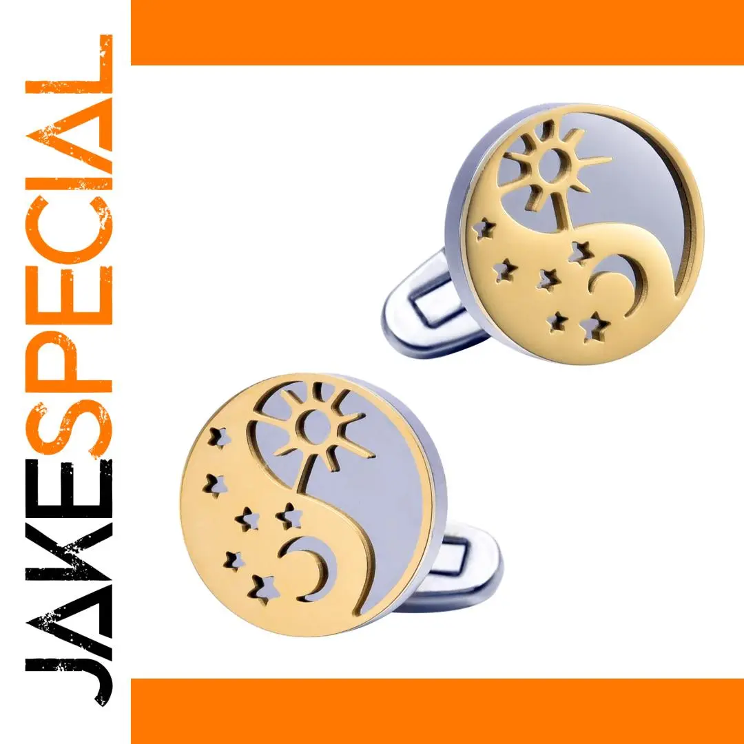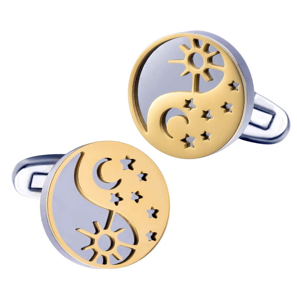 Step into sophistication with this pair of this dual-color yin-yang cufflinks, designed to elevate your formal wardrobe. Crafted from lightweight alloy with a hollow-out construction, these cufflinks combine style and symbolism effortlessly. The circular face features a striking yin-yang motif, with opposite-colored segments in a tasteful gold and light grey palette. Decorative sun rays and crescent moon cut-outs add celestial allure, while scattered stars enhance the cosmic theme. Its smooth, rounded edges showcase refined craftsmanship, making them suitable for both men and women. Whether for a business meeting or a special event, these cufflinks will subtly complement any outfit while reflecting your unique personality and aesthetic preference.