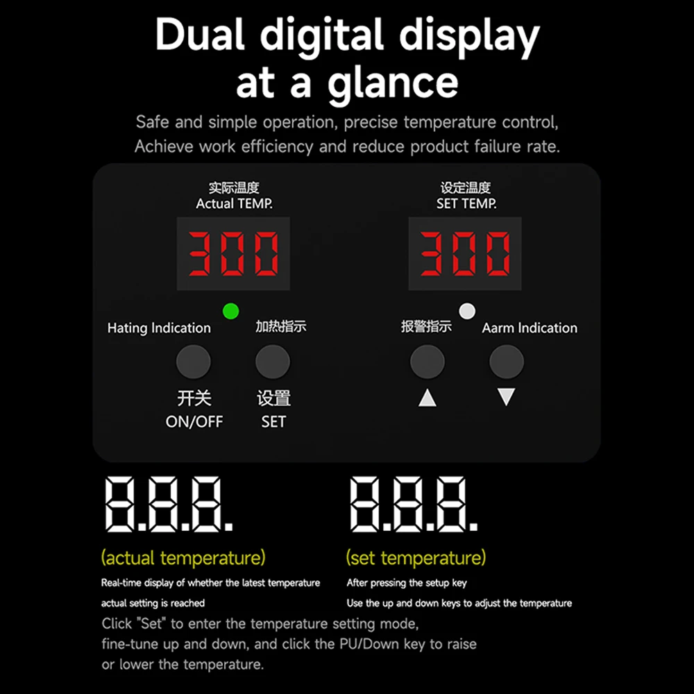 - Powerful operation with 800W or 1000W, supporting adjustable temperatures up to 300°C, ideal for various industrial and electronic applications.