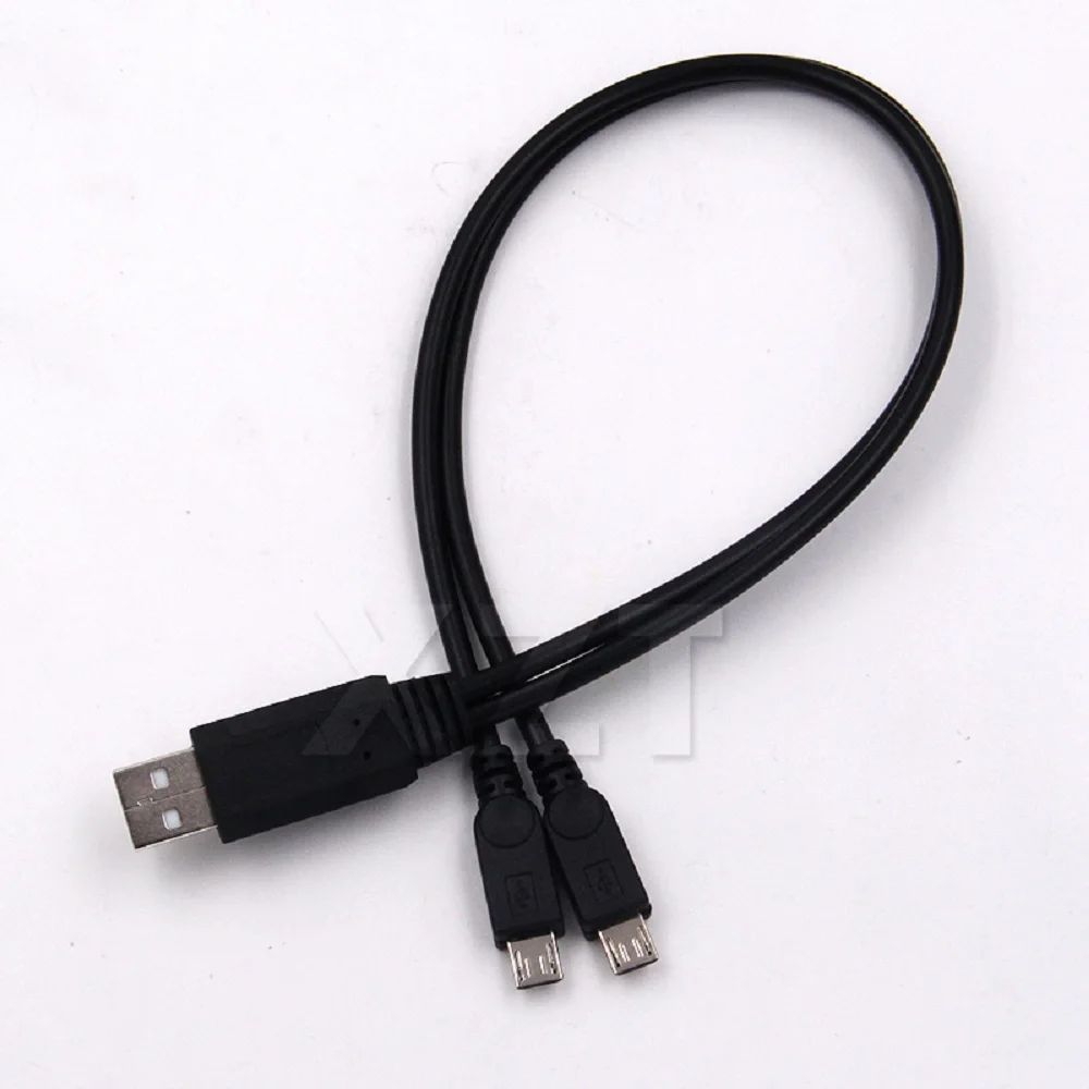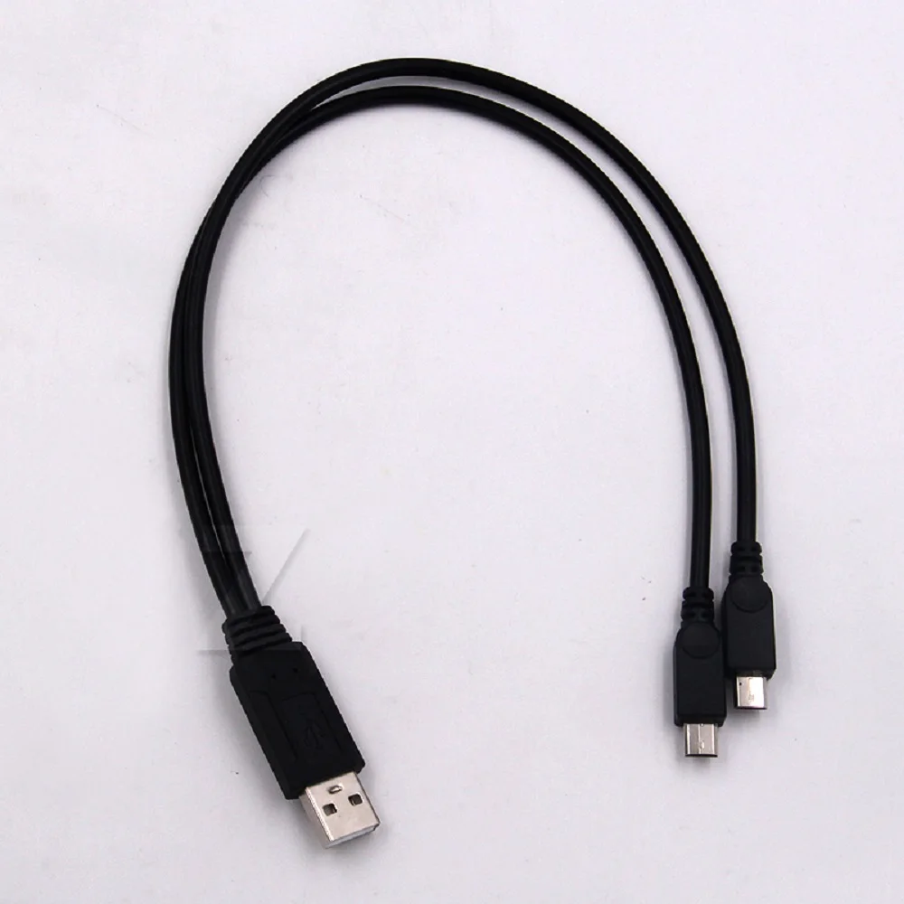 Experience the convenience of this this portable USB Y-shaped splitter cable, designed to allow you to charge two mobile phones simultaneously. Crafted with sleek black plastic and a flexible matte finish, it offers a simple yet functional aesthetic suited for everyday use. The main USB Type-A male connector features a rectangular shape with sharp, clean lines and metallic contacts visible at the tip, emphasizing durability and reliability. Extending from this are two micro USB male connectors, matching in rectangular form with rounded edges, creating a cohesive, minimalist design. Compact and unobtrusive, this cable is perfect for emergencies or daily multitasking, saving time and space. Its streamlined silhouette ensures compatibility with most smart devices for a hassle-free charging experience.