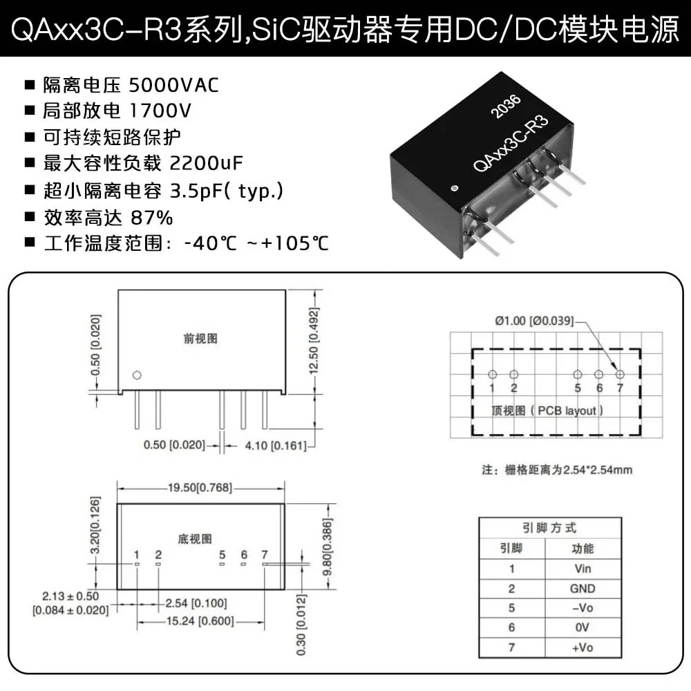 Imagine elevating your power management system with this high-performance dual output SiC driver module. Designed for precise DC/DC voltage conversion, it features a sleek matte black rectangular casing with smooth edges and a slightly glossy finish, emphasizing its industrial robustness. The white printed text on the surface ensures clear identification of the model number QA053C-2004R3 and the reference number 2036. On one side, three evenly spaced silver-colored metallic pins extend straight out, facilitating reliable electrical connections. This compact, purpose-driven component enhances your circuit's efficiency, offering dedicated 20V and -4V outputs from a 4.5V to 5.5V input range. Its minimalistic design complements any technical setup, promising durability and straightforward integration in your high-performance applications.