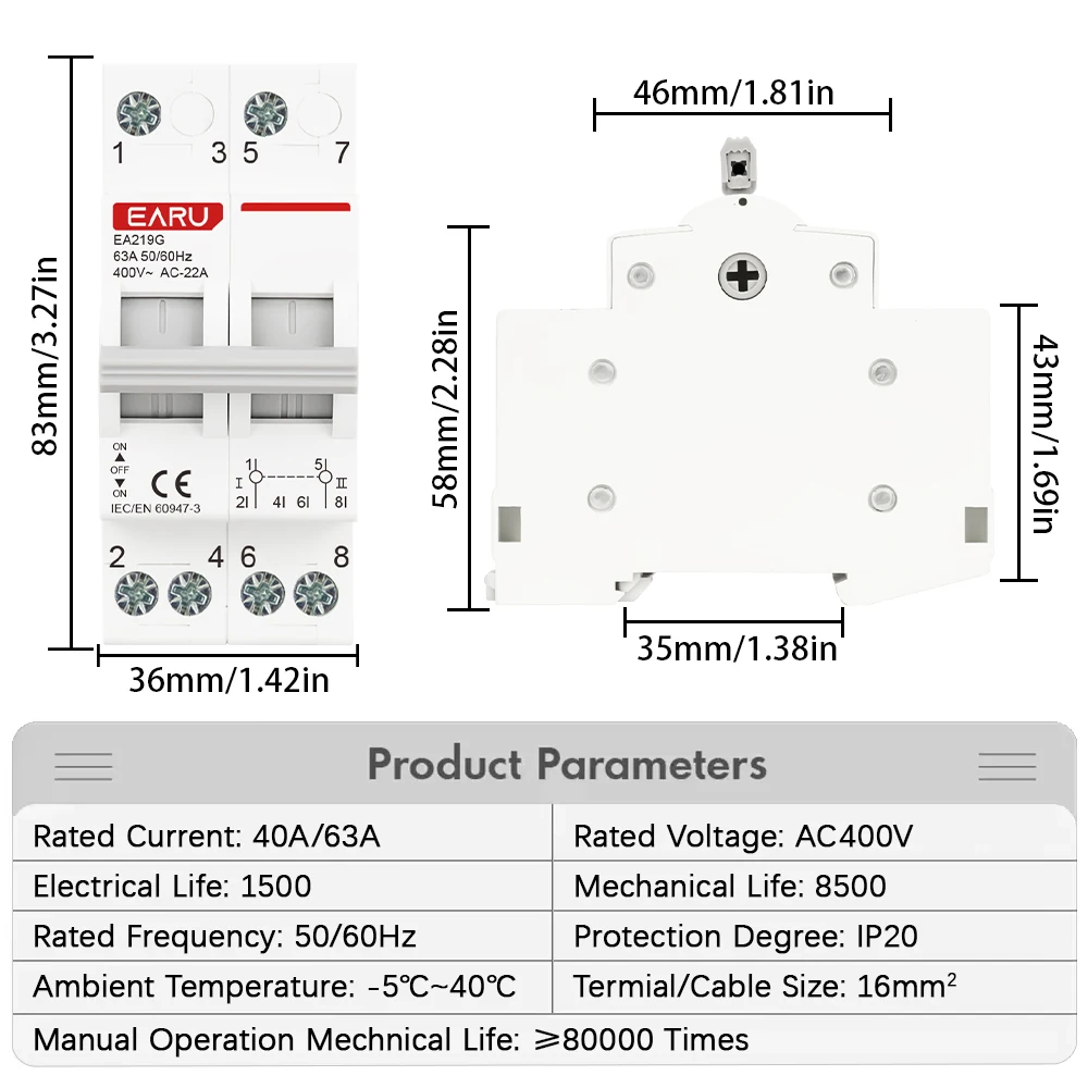 - Technical specifications include a rated current of 40A/63A, electrical life of 1500 cycles, mechanical life of 8500 cycles, operating temperature -5°C to 40°C, and protection against accidental contact with IP20 level.