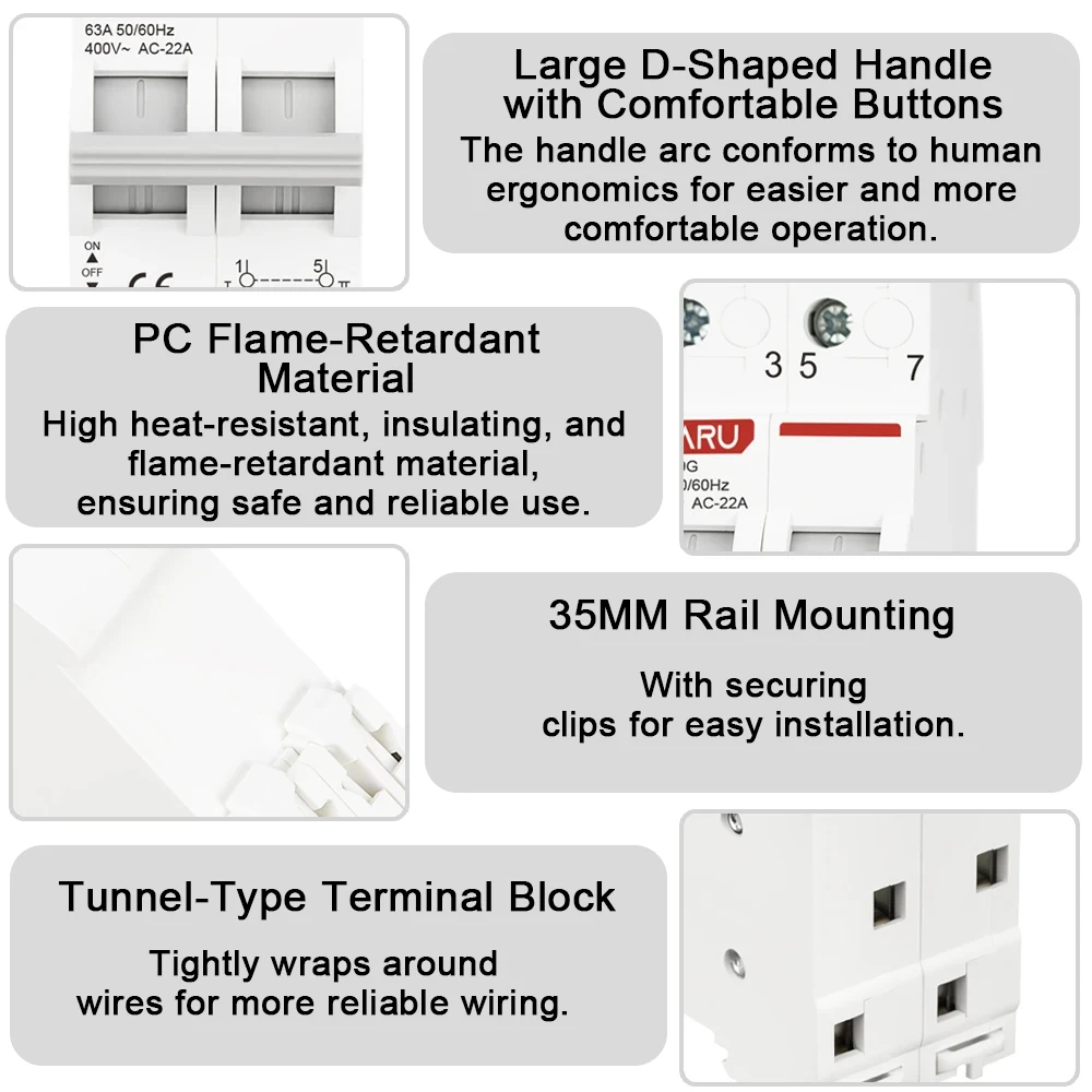 - Rated currents are 40A and 63A, suitable for high-demand industrial power switching. Operates at AC400V with a frequency of 50/60Hz for versatile applications.