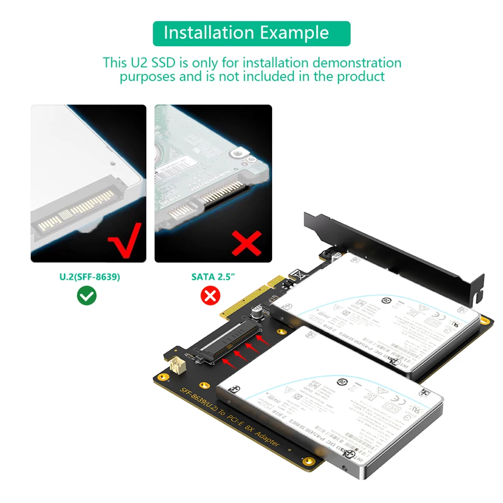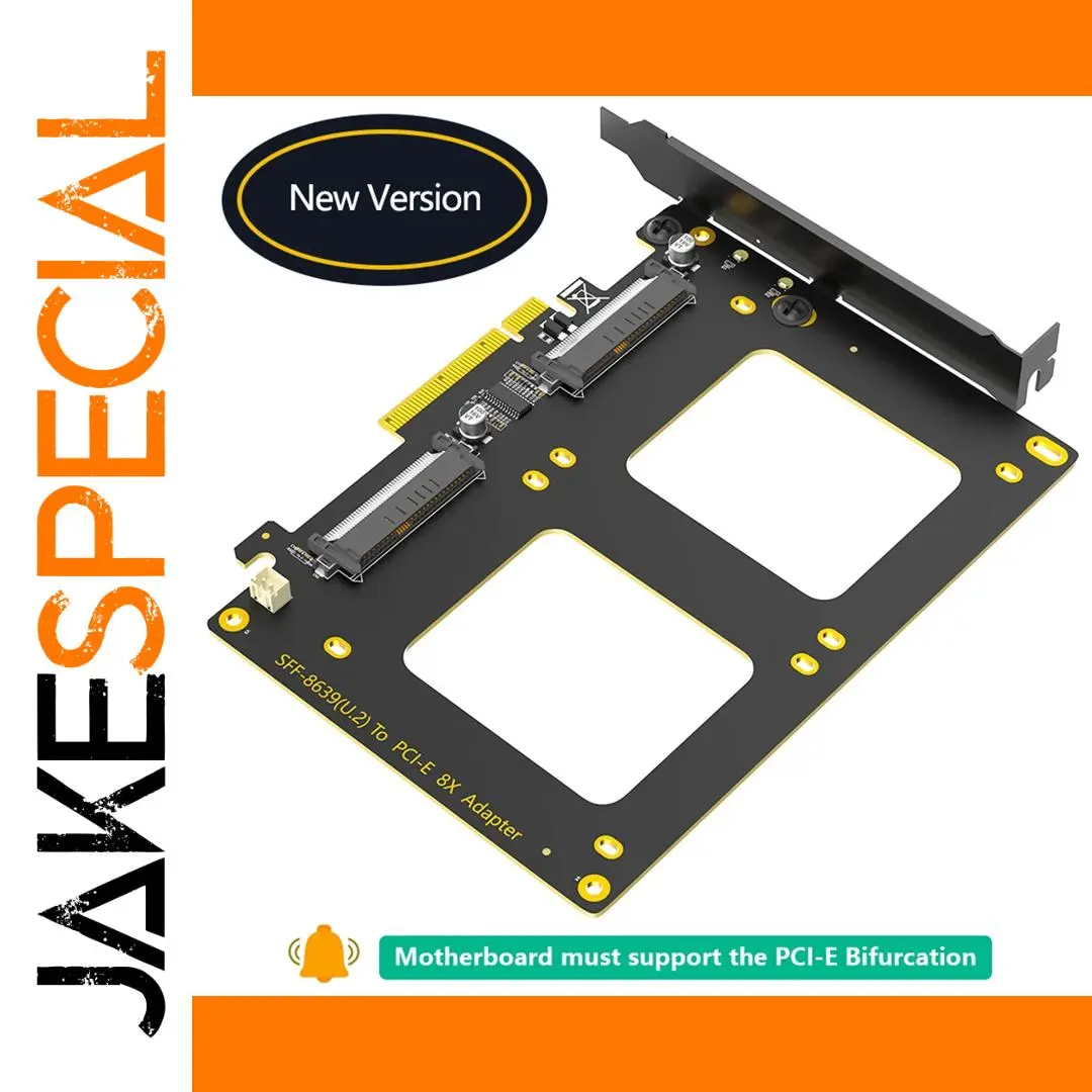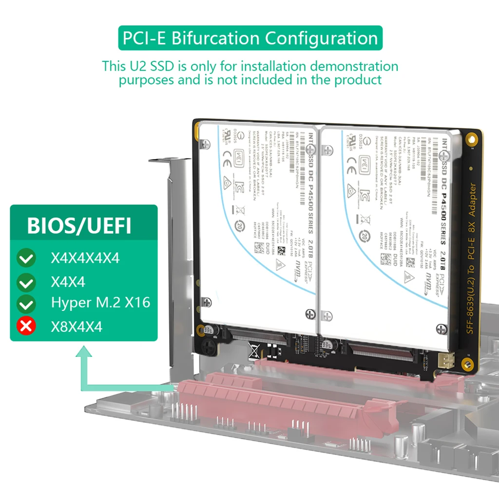 Enhance your high-performance storage setup with this Dual U.2 SSD to PCIe 4.0 x8 adapter card, supporting two U.2 SSDs simultaneously via PCIe 4.0 x8 interface. Designed for advanced users, it supports PCIe bifurcation modes including X4X4X4X4, X4X4X8, and Hyper M.2 X16, requiring a compatible motherboard with PCIe bifurcation support. Capable of enabling Soft RAID on Intel and AMD platforms, it allows OS booting with proper BIOS/UEFI configuration, and offers plug-and-play compatibility with Windows 11/10/8, Linux, and Mac OS. Achieve full PCIe 4.0 x4 speeds (64Gbps) when used with compatible CPU, motherboard slot, and SSD.