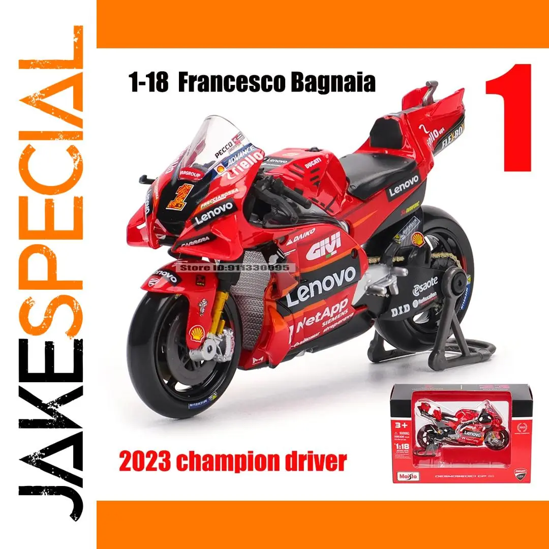 This stunning 1:18 scale die-cast model motorcycle celebrates the prowess of Francesco Bagnaia, the 2023 champion driver. The vibrant red color captures the essence of Ducati's iconic branding, making it a must-have for any serious collector. With intricate details, including well-defined fairings, realistic wheel treads, and precision logos from Lenovo, NetApp, and Shell, this model showcases exceptional craftsmanship. The motorcycle is presented on a display stand, enhancing its appeal for enthusiasts. Imagine adding this striking piece to your collection, relishing its beauty and the victory it represents in the racing world.