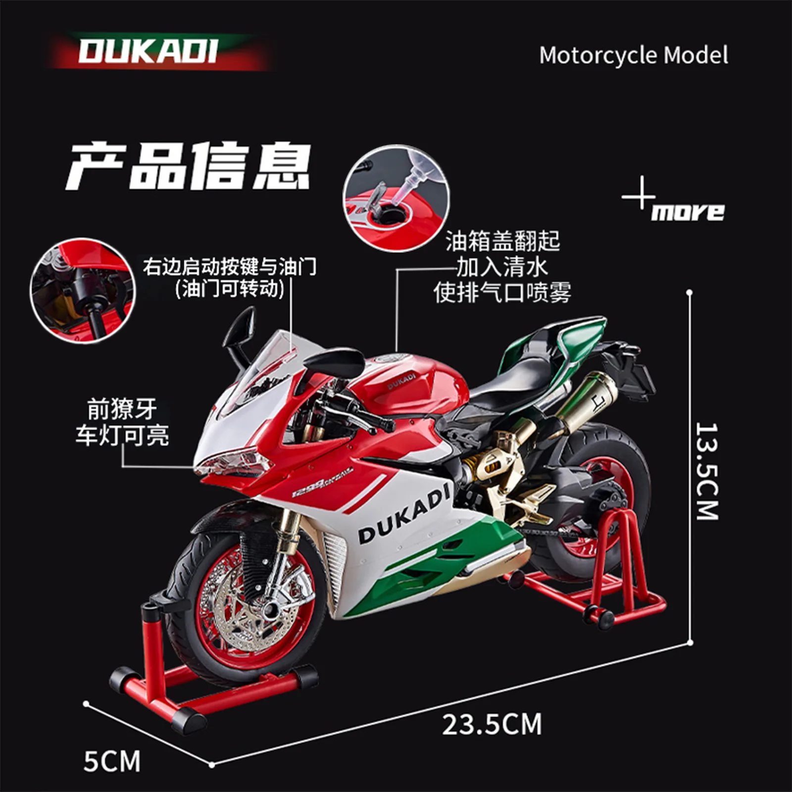 Immerse yourself in the world of high-performance motorcycles with this highly detailed 1:9 scale diecast model of the Ducati 1199 Panigale R. Crafted from alloy, it features a vibrant tricolore paint scheme in red, white, and green, complemented by black accents and realistic aerodynamic fairings. The model includes illuminated lights, authentic exhaust and front suspension components, and vivid red wheels with detailed brake discs. Operable via a button battery, it also offers sound effects for enhanced display. Perfect for collectors and enthusiasts, this premium piece replicates the sleek, racing-inspired style of the original Ducati, bringing a sense of speed and sophistication to any collection.